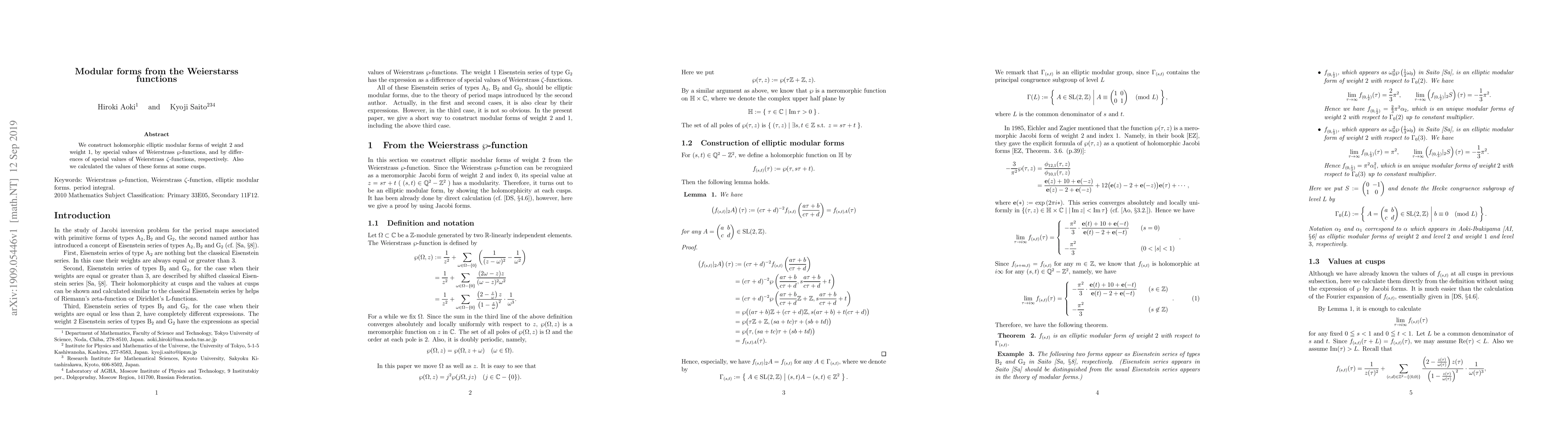 This paper constructs holomorphic elliptic modular forms of weight 2 and weight 1 using special values of Weierstrass p-functions and differences of special values of Weierstrass zeta-functions, respectively, and computes their values at specific cusps.
