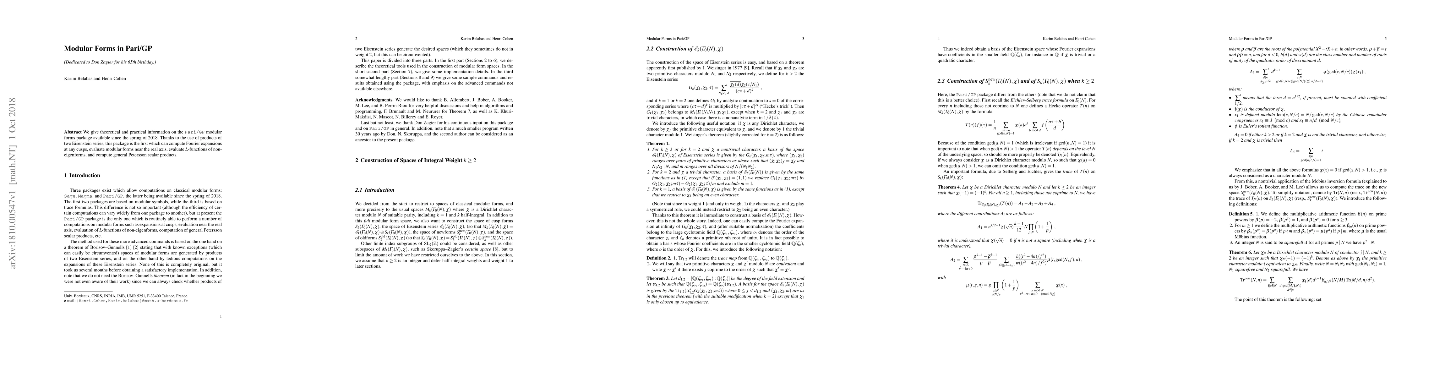 Summary: The Pari/GP modular forms package introduced in 2018 enables computing Fourier expansions at any cusps and evaluating modular forms using Eisenstein series, including L-functions of non-eigenforms and general Petersson scalar products. This package is notable for its comprehensive functionality in modular forms computation.