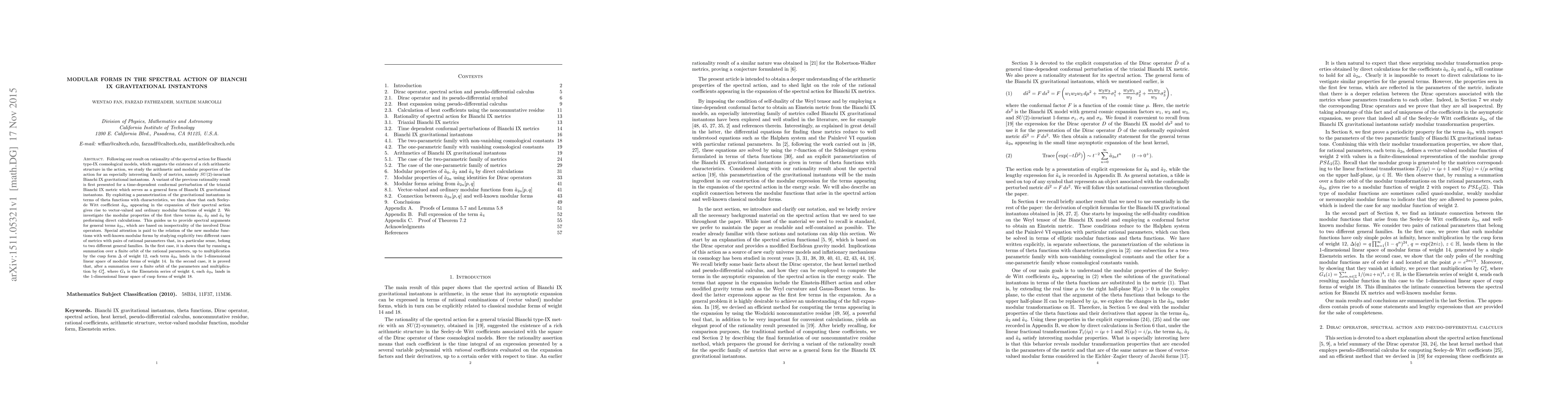 Researchers study modular forms in Bianchi IX gravitational instantons, finding that each coefficient in the spectral action gives rise to vector-valued and ordinary modular functions of weight 2, with implications for understanding arithmetic structures in the action.