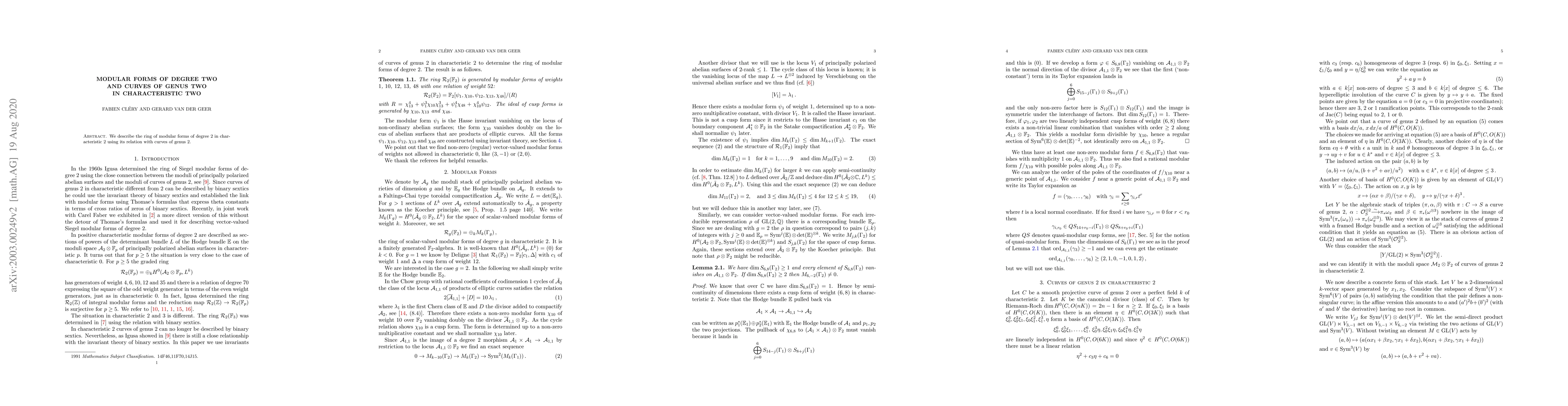 Summary: This paper explores the ring of modular forms of degree two in characteristic two, elucidating its structure through its connection with curves of genus two. The study reveals significant insights into the interplay between modular forms and algebraic geometry.