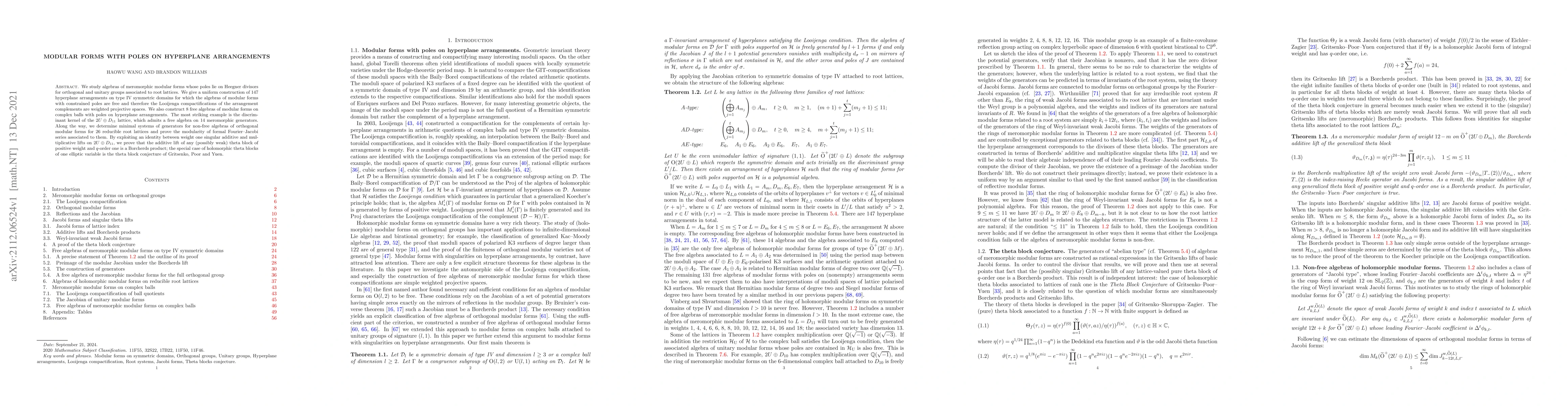 We study algebras of meromorphic modular forms whose poles lie on Heegner divisors for orthogonal and unitary groups associated to root lattices. We give a uniform construction of $147$ hyperplane arrangements on type IV symmetric domains for which the algebras of modular forms with constrained poles are free and therefore the Looijenga compactifications of the arrangement complements are weighted projective spaces. We also construct $8$ free algebras of modular forms on complex balls with poles on hyperplane arrangements. The most striking example is the discriminant kernel of the $2U\oplus D_{11}$ lattice, which admits a free algebra on $14$ meromorphic generators. Along the way, we determine minimal systems of generators for non-free algebras of orthogonal modular forms for $26$ reducible root lattices and prove the modularity of formal Fourier--Jacobi series associated to them. By exploiting an identity between weight one singular additive and multiplicative lifts on $2U\oplus D_{11}$, we prove that the additive lift of any (possibly weak) theta block of positive weight and $q$-order one is a Borcherds product; the special case of holomorphic theta blocks of one elliptic variable is the theta block conjecture of Gritsenko, Poor and Yuen.