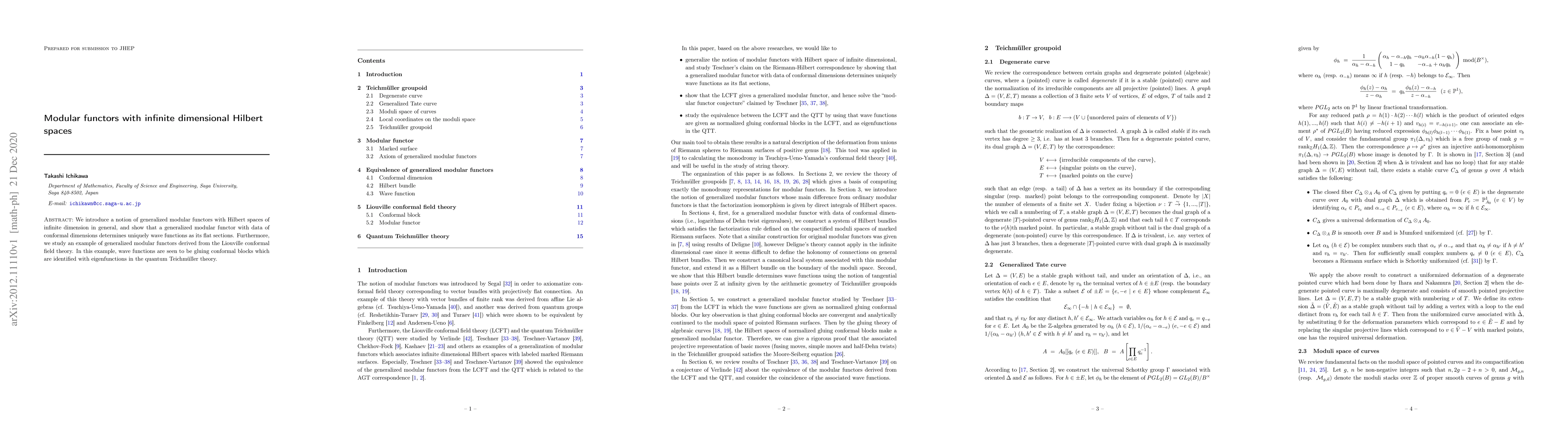 This paper introduces generalized modular functors for infinite-dimensional Hilbert spaces and demonstrates that these functors uniquely determine wave functions via their flat sections. An example derived from Liouville conformal field theory illustrates how wave functions correspond to gluing conformal blocks identified with eigenfunctions in quantum Teichmüller theory.