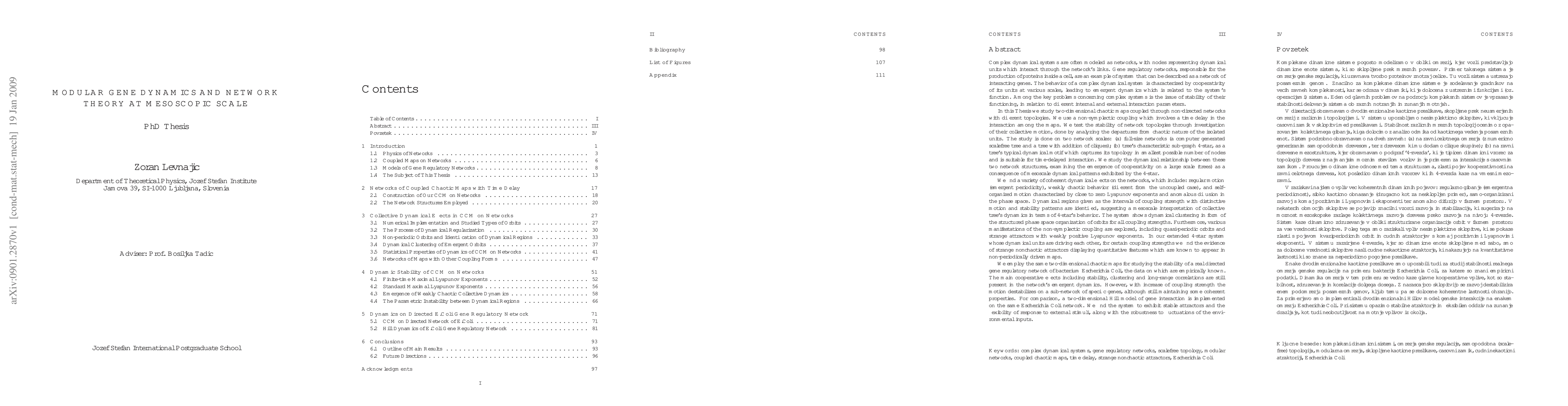 Complex dynamical systems are often modeled as networks, with nodes representing dynamical units which interact through the network's links. Gene regulatory networks, responsible for the production of proteins inside a cell, are an example of system that can be described as a network of interacting genes. The behavior of a complex dynamical system is characterized by cooperativity of its units at various scales, leading to emergent dynamics which is related to the system's function. Among the key problems concerning complex systems is the issue of stability of their functioning, in relation to different internal and external interaction parameters. In this Thesis we study two-dimensional chaotic maps coupled through non-directed networks with different topologies. We use a non-symplectic coupling which involves a time delay in the interaction among the maps. We test the stability of network topologies through investigation of their collective motion, done by analyzing the departures from chaotic nature of the isolated units. The study is done on two network scales: (a) full-size networks (a computer generated scalefree tree and a tree with addition of cliques); (b) tree's characteristic sub-graph 4-star, as a tree's typical dynamical motif which captures its topology in smallest possible number of nodes and is suitable for time-delayed interaction. We study the dynamical relationship between these two network structures, examining the emergence of cooperativity on a large scale (trees) as a consequence of mesoscale dynamical patterns exhibited by the 4-star. (FULL ABSTRACT INSIDE THE TEXT)
