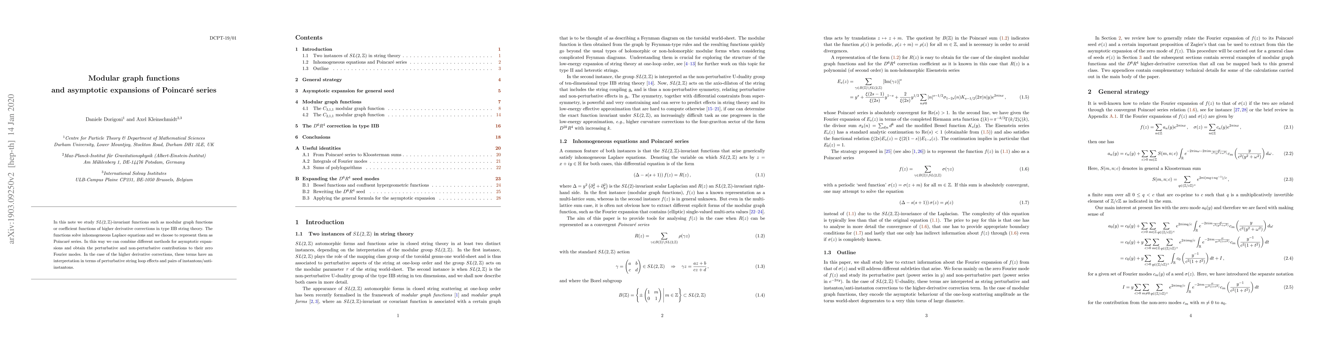 This paper investigates $SL(2,\mathbb{Z})$-invariant modular graph functions, representing them as Poincaré series to derive their asymptotic expansions. It combines various methods to extract both perturbative and non-perturbative contributions from zero Fourier modes, linking higher derivative corrections to string loop effects and instanton pairs.