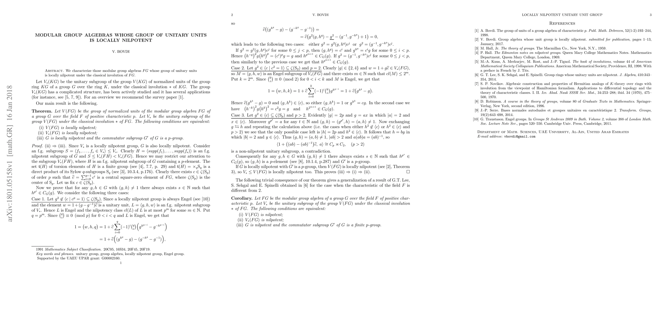 Summary: This paper identifies modular group algebras FG where the group of unitary units is locally nilpotent, providing a characterization based on the classical involution. This insight helps to understand the algebraic structure of such group algebras.