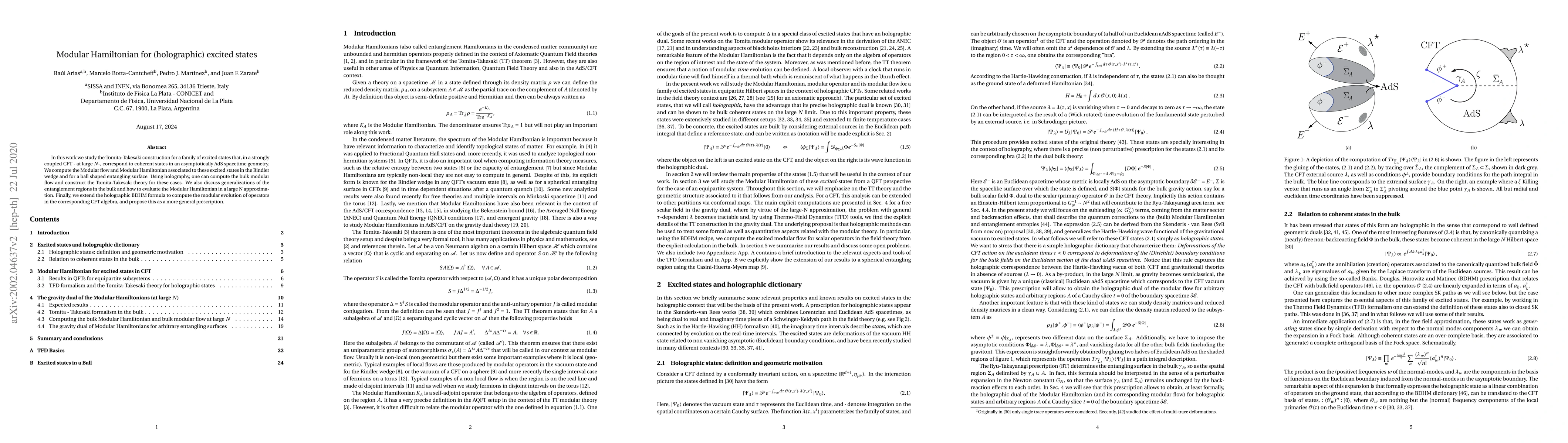 This paper investigates the Tomita-Takesaki construction for excited states in a strongly coupled conformal field theory at large $N$, using holography to compute modular flow and modular Hamiltonian in Rindler wedges and ball-shaped entangling surfaces. It also explores the estimation of the modular Hamiltonian via large N approximation and presents a holographic formula for operator evolution in the CFT algebra.