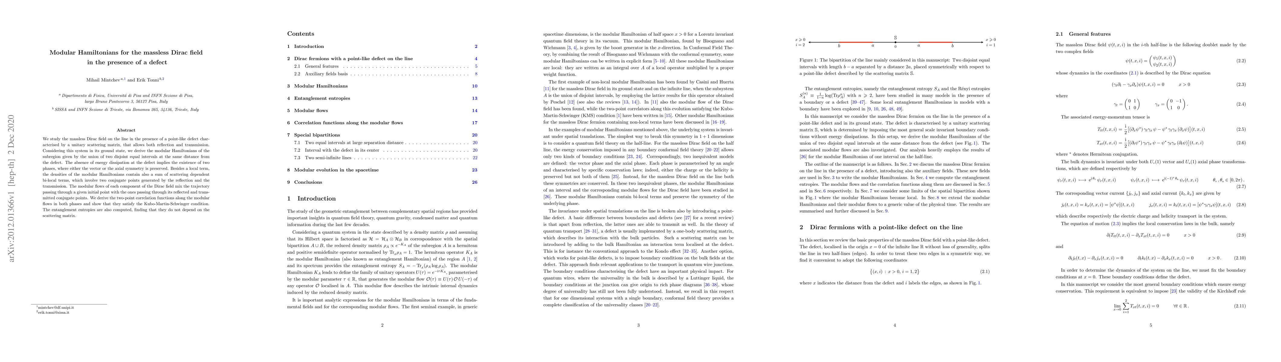 We study the massless Dirac field on the line in the presence of a point-like defect characterised by a unitary scattering matrix, that allows both reflection and transmission. Considering this system in its ground state, we derive the modular Hamiltonians of the subregion given by the union of two disjoint equal intervals at the same distance from the defect. The absence of energy dissipation at the defect implies the existence of two phases, where either the vector or the axial symmetry is preserved. Besides a local term, the densities of the modular Hamiltonians contain also a sum of scattering dependent bi-local terms, which involve two conjugate points generated by the reflection and the transmission. The modular flows of each component of the Dirac field mix the trajectory passing through a given initial point with the ones passing through its reflected and transmitted conjugate points. We derive the two-point correlation functions along the modular flows in both phases and show that they satisfy the Kubo-Martin-Schwinger condition. The entanglement entropies are also computed, finding that they do not depend on the scattering matrix.