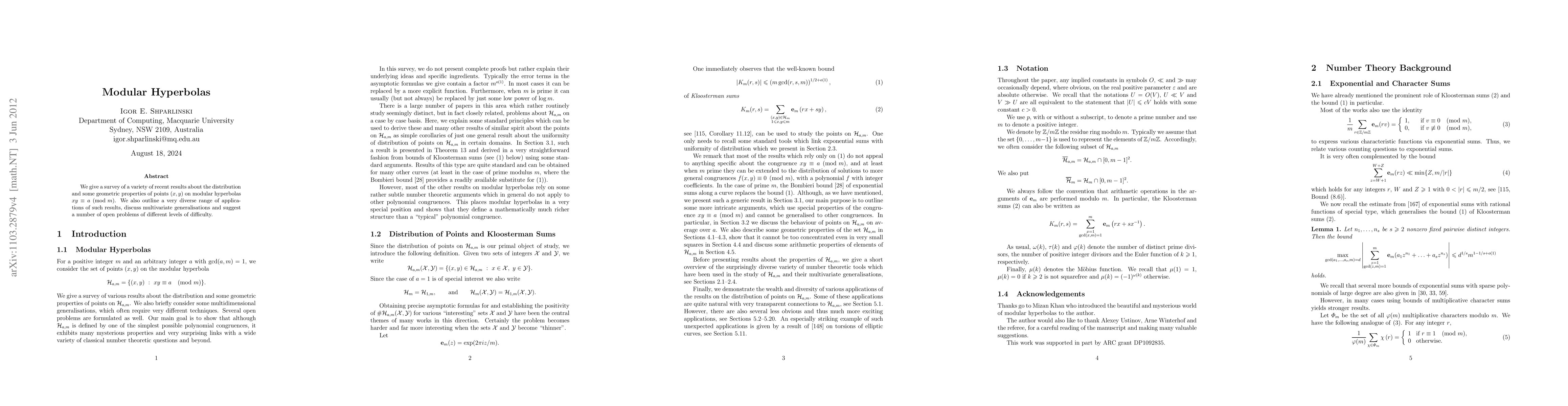 We give a survey of a variety of recent results about the distribution and some geometric properties of points $(x,y)$ on modular hyperbolas $xy \equiv a \pmod m$. We also outline a very diverse range of applications of such results, discuss multivariate generalisations and suggest a number of open problems of different levels of difficulty.
