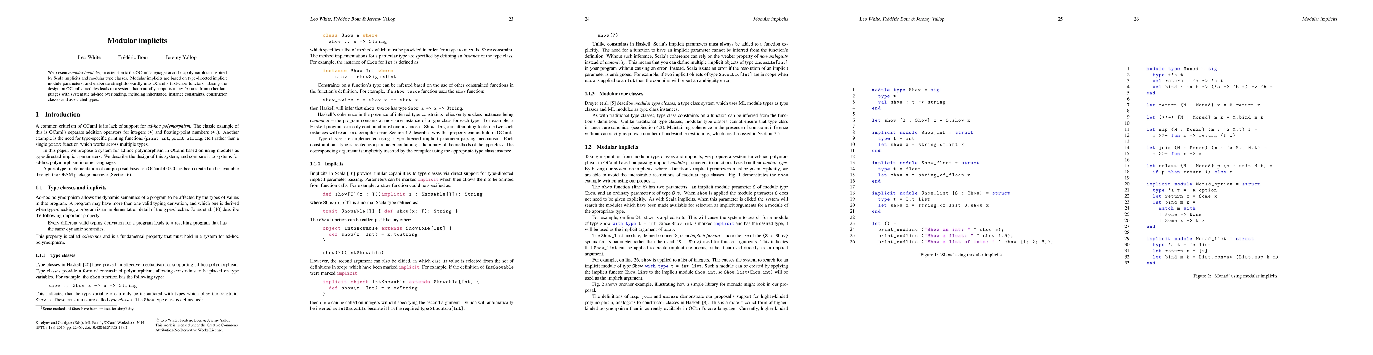 This paper introduces modular implicits, an OCaml extension enabling ad-hoc polymorphism akin to Scala's implicits, utilizing type-directed implicit module parameters and OCaml's first-class functors. It supports features like inheritance and instance constraints, mirroring systematic ad-hoc overloading found in other languages.