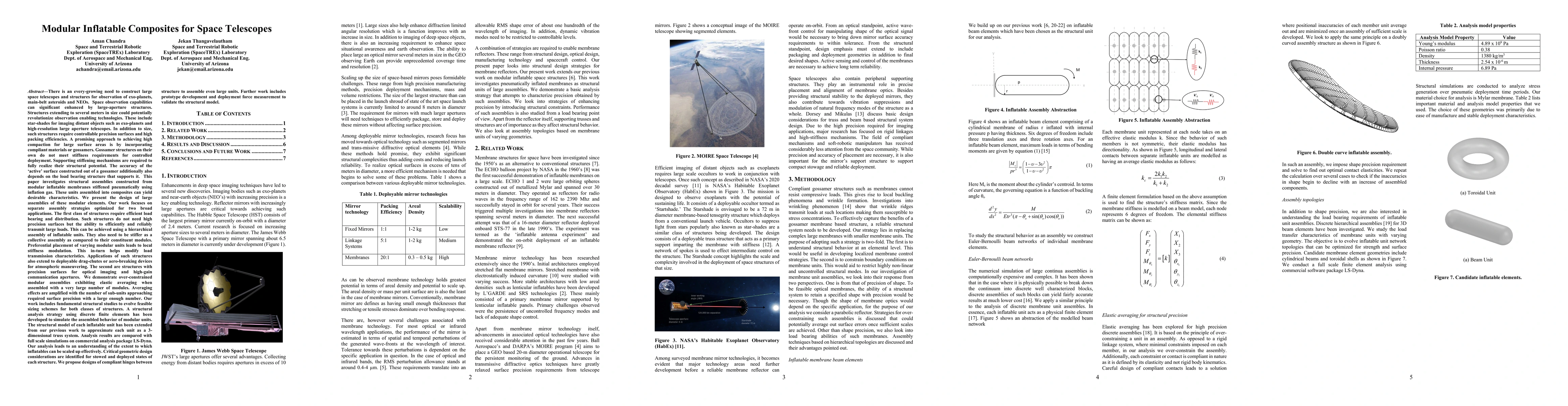 This paper explores the use of modular inflatable composites for constructing large space telescopes, stiffened by inflation gas for controlled deployment and precision. It presents designs for large assemblies of these elements, aiming to meet stiffness requirements and high packing efficiencies needed for advanced observation technologies.