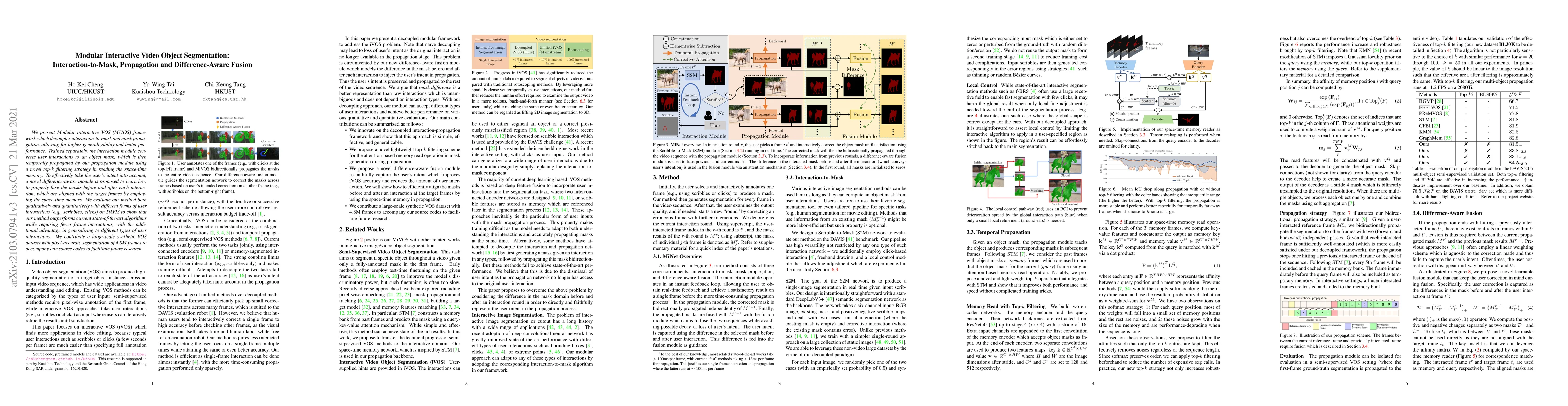 We present Modular interactive VOS (MiVOS) framework which decouples interaction-to-mask and mask propagation, allowing for higher generalizability and better performance. Trained separately, the interaction module converts user interactions to an object mask, which is then temporally propagated by our propagation module using a novel top-$k$ filtering strategy in reading the space-time memory. To effectively take the user's intent into account, a novel difference-aware module is proposed to learn how to properly fuse the masks before and after each interaction, which are aligned with the target frames by employing the space-time memory. We evaluate our method both qualitatively and quantitatively with different forms of user interactions (e.g., scribbles, clicks) on DAVIS to show that our method outperforms current state-of-the-art algorithms while requiring fewer frame interactions, with the additional advantage in generalizing to different types of user interactions. We contribute a large-scale synthetic VOS dataset with pixel-accurate segmentation of 4.8M frames to accompany our source codes to facilitate future research.