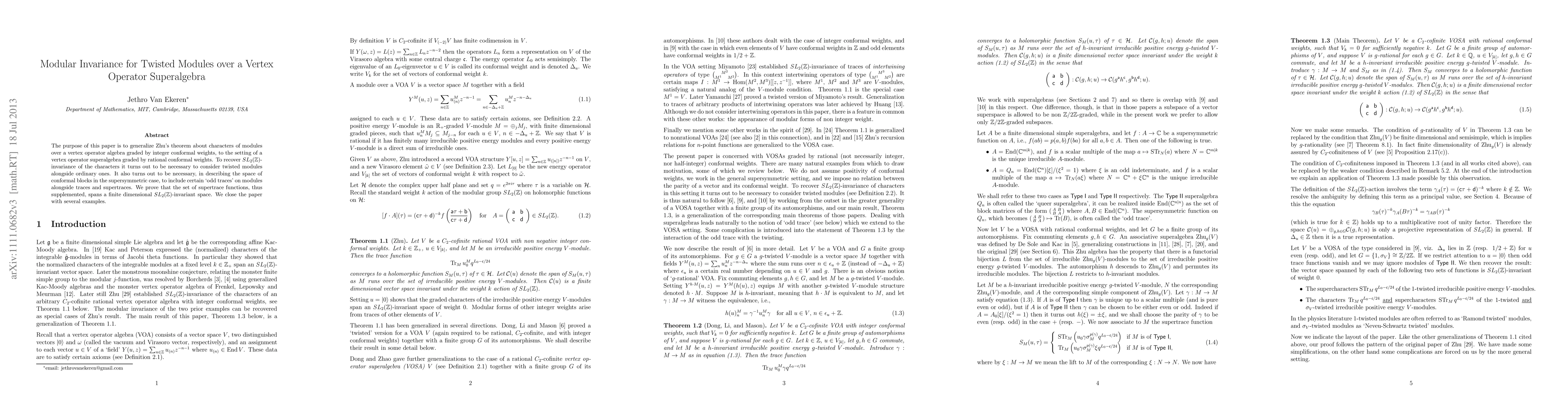 The paper generalizes Zhu's theorem to vertex operator superalgebras with rational conformal weights, requiring the inclusion of twisted modules and certain 'odd traces' for SL_2(Z)-invariance in the space of conformal blocks.