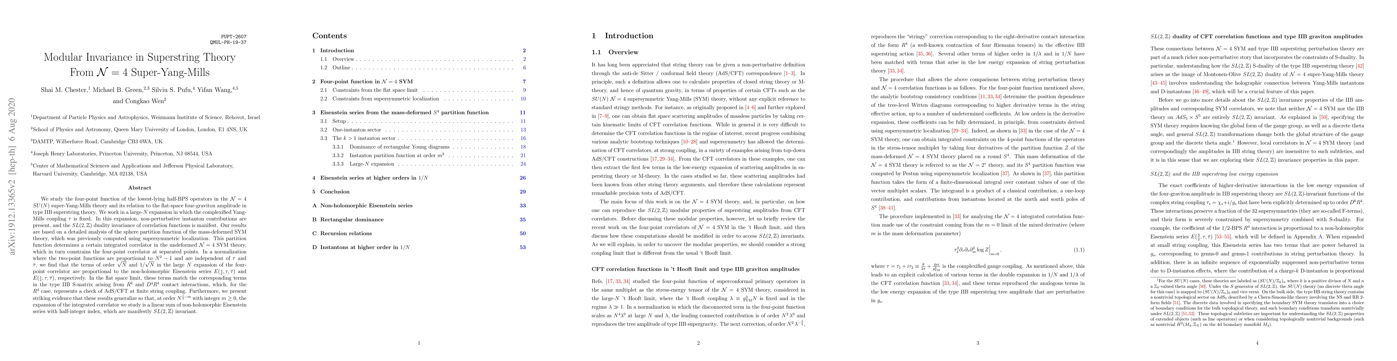 We study the four-point function of the lowest-lying half-BPS operators in the ${\cal N} =4$ $SU(N)$ super-Yang-Mills theory and its relation to the flat-space four-graviton amplitude in type IIB superstring theory. We work in a large-$N$ expansion in which the complexified Yang-Mills coupling $\tau$ is fixed. In this expansion, non-perturbative instanton contributions are present, and the $SL(2, \mathbb{Z})$ duality invariance of correlation functions is manifest. Our results are based on a detailed analysis of the sphere partition function of the mass-deformed SYM theory, which was previously computed using supersymmetric localization. This partition function determines a certain integrated correlator in the undeformed ${\cal N} = 4$ SYM theory, which in turn constrains the four-point correlator at separated points. In a normalization where the two-point functions are proportional to $N^2-1$ and are independent of $\tau$ and $\bar \tau$, we find that the terms of order $\sqrt{N}$ and $1/\sqrt{N}$ in the large $N$ expansion of the four-point correlator are proportional to the non-holomorphic Eisenstein series $E({\scriptstyle \frac{3}{2}},\tau,\bar\tau)$ and $E({\scriptstyle \frac{5}{2}},\tau,\bar\tau)$, respectively. In the flat space limit, these terms match the corresponding terms in the type IIB S-matrix arising from $R^4$ and $D^4 R^4$ contact interactions, which, for the $R^4$ case, represents a check of AdS/CFT at finite string coupling. Furthermore, we present striking evidence that these results generalize so that, at order $N^{\frac{1}{2}-m}$ with integer $m \ge 0$, the expansion of the integrated correlator we study is a linear sum of non-holomorphic Eisenstein series with half-integer index, which are manifestly $SL(2,\mathbb{Z})$ invariant.
