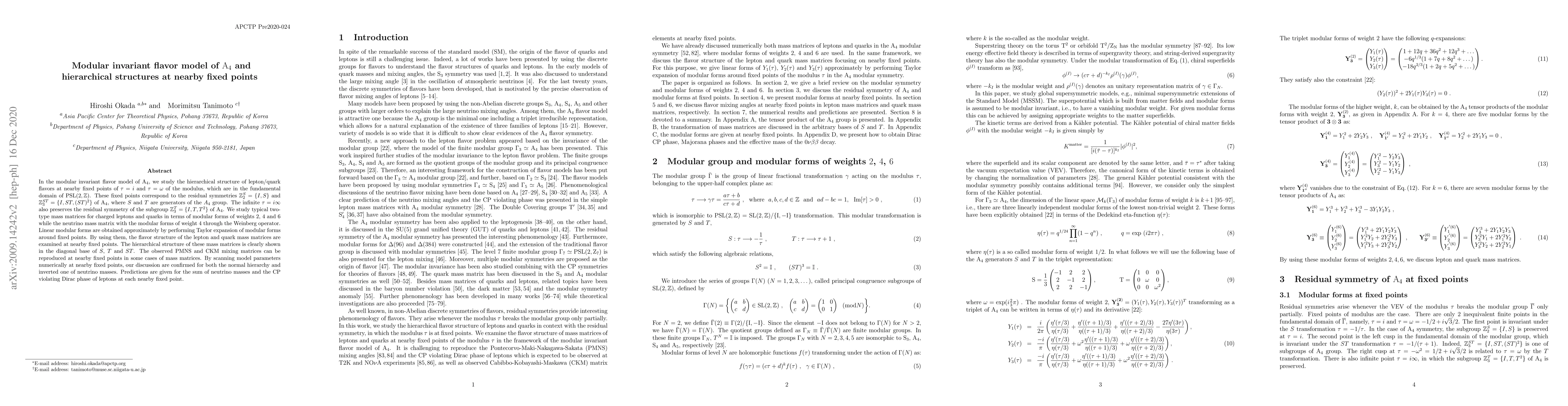 In the modular invariant flavor model of $\rm A_4$, we study the hierarchical structure of lepton/quark flavors at nearby fixed points of $\tau=i$ and $\tau=\omega$ of the modulus, which are in the fundamental domain of $\rm PSL(2,\mathbb{Z})$. These fixed points correspond to the residual symmetries $\mathbb{Z}_2^{S}=\{I, S \}$ and $\mathbb{Z}_3^{S}=\{ I, ST, (ST)^2 \}$ of $\rm A_4$, where $S$ and $T$ are generators of the $A_4$ group. The infinite $\tau= i \infty$ also preserves the residual symmetry of the subgroup $\mathbb{Z}^T_3=\{ I,T,T^2 \}$ of $\rm A_4$. We study typical two-type mass matrices for charged leptons and quarks in terms of modular forms of weights $2$, $4$ and $6$ while the neutrino mass matrix with the modular forms of weight $4$ through the Weinberg operator. Linear modular forms are obtained approximately by performing Taylor expansion of modular forms around fixed points. By using them, the flavor structure of the lepton and quark mass matrices are examined at nearby fixed points. The hierarchical structure of these mass matrices is clearly shown in the diagonal base of $S$, $T$ and $ST$. The observed PMNS and CKM mixing matrices can be reproduced at nearby fixed points in some cases of mass matrices. By scanning model parameters numerically at nearby fixed points, our discussion are confirmed for both the normal hierarchy and inverted one of neutrino masses. Predictions are given for the sum of neutrino masses and the CP violating Dirac phase of leptons at each nearby fixed point.