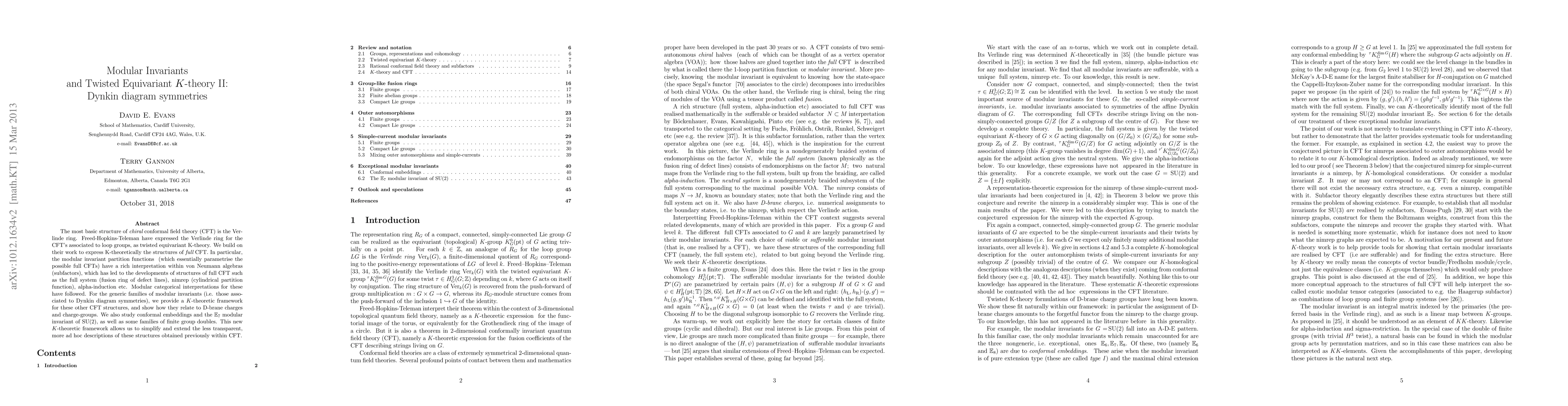 This paper develops a K-theoretic framework for understanding the modular invariants and associated structures in full chiral conformal field theory, particularly focusing on Dynkin diagram symmetries. It simplifies and extends previous descriptions by relating these structures to D-brane charges and charge-groups, and explores conformal embeddings and specific cases like the E7 modular invariant.