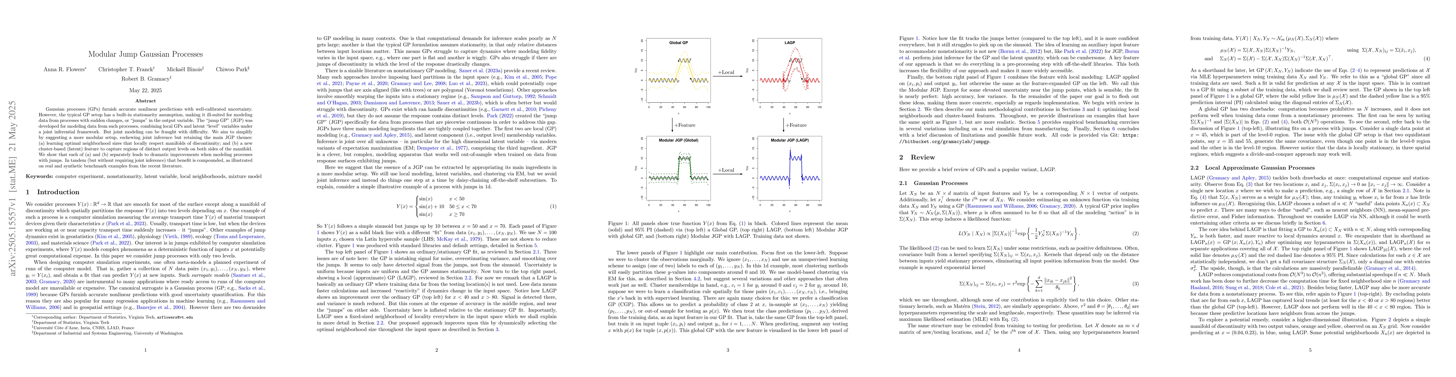 The paper proposes 'Modular Jump Gaussian Processes' to model data with sudden changes, or 'jumps', in output variables. It simplifies the 'jump GP' model by separately optimizing neighborhood sizes and introducing cluster-based latent features, demonstrating significant improvements on real and synthetic examples without needing joint inference.