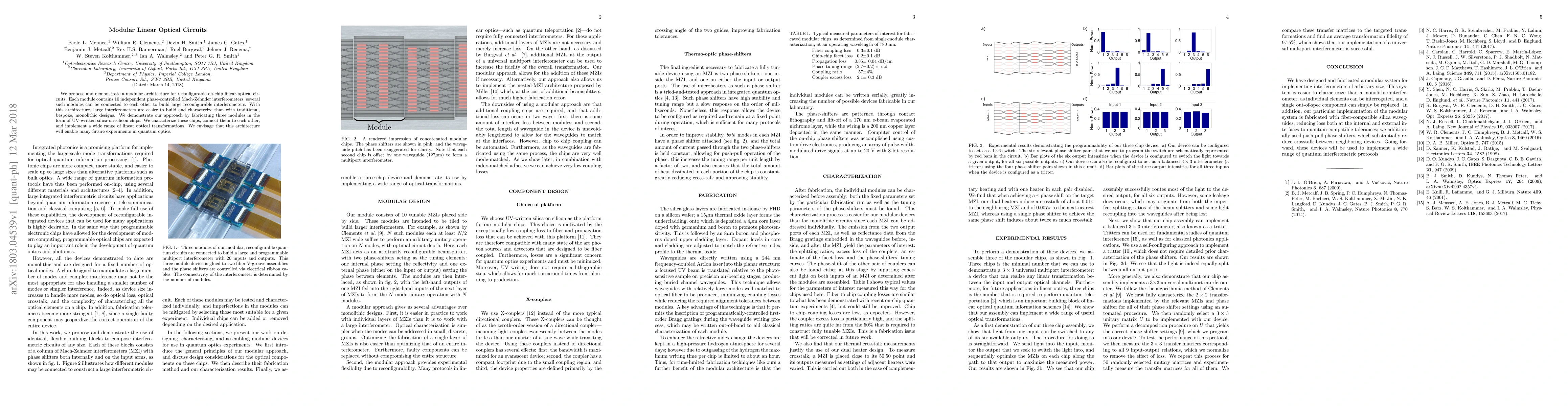 The research introduces a modular design for large-scale, reconfigurable linear-optical circuits using phase-controlled Mach-Zehnder interferometers. Three silica-on-silicon chips, each containing 10 interferometers, are fabricated, demonstrated, and connected to implement various linear optical transformations, paving the way for extensive quantum optics experiments.