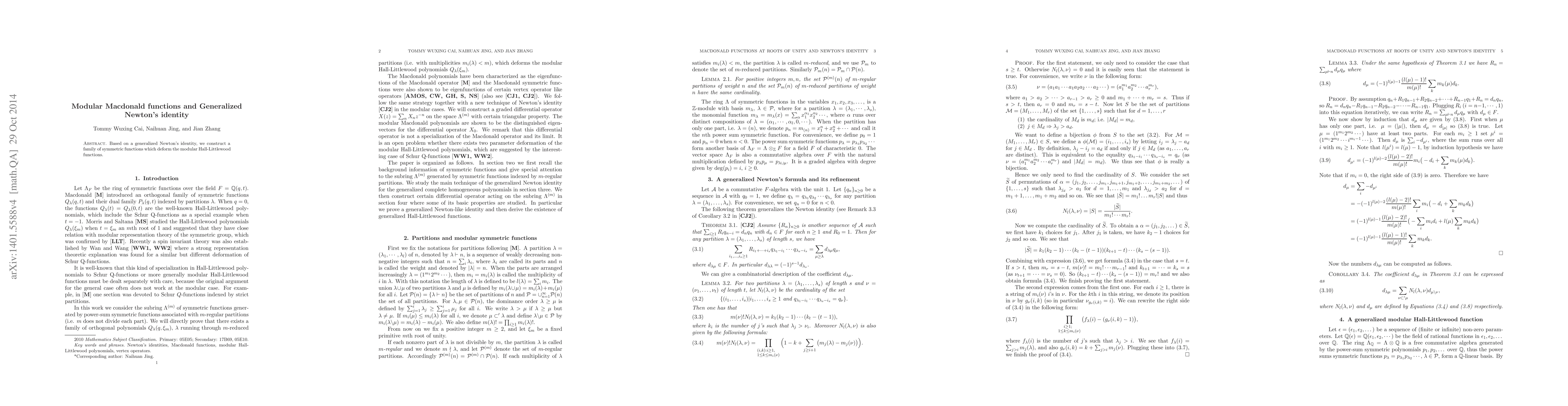 Summary: This paper constructs a family of symmetric functions that deform modular Hall-Littlewood functions using a generalized Newton's identity and provides a determinant formula for Macdonald functions.