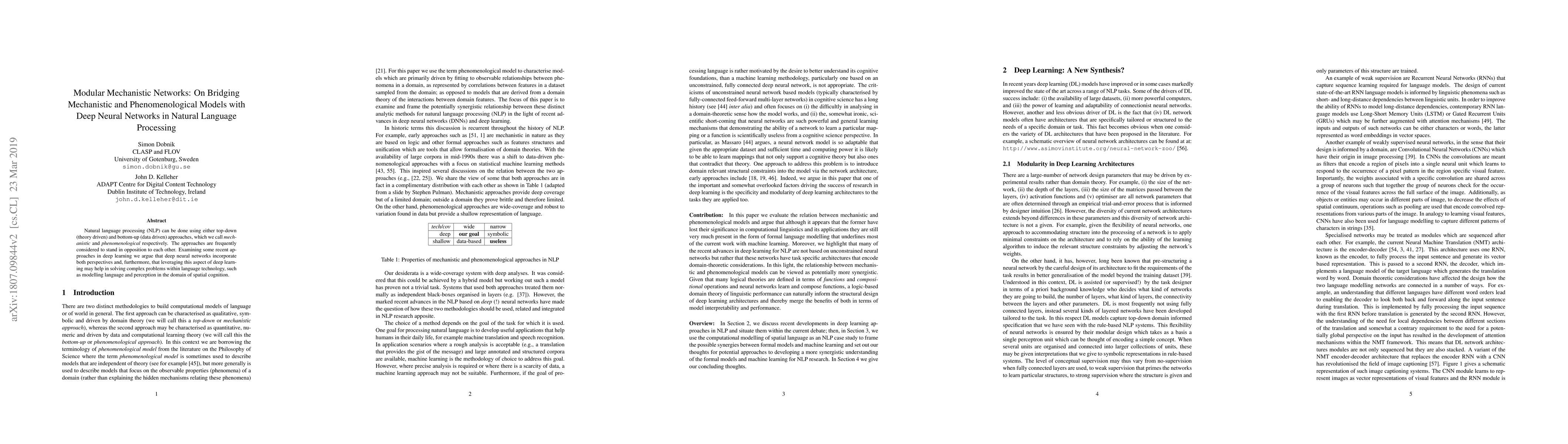 Natural language processing (NLP) can be done using either top-down (theory driven) and bottom-up (data driven) approaches, which we call mechanistic and phenomenological respectively. The approaches are frequently considered to stand in opposition to each other. Examining some recent approaches in deep learning we argue that deep neural networks incorporate both perspectives and, furthermore, that leveraging this aspect of deep learning may help in solving complex problems within language technology, such as modelling language and perception in the domain of spatial cognition.