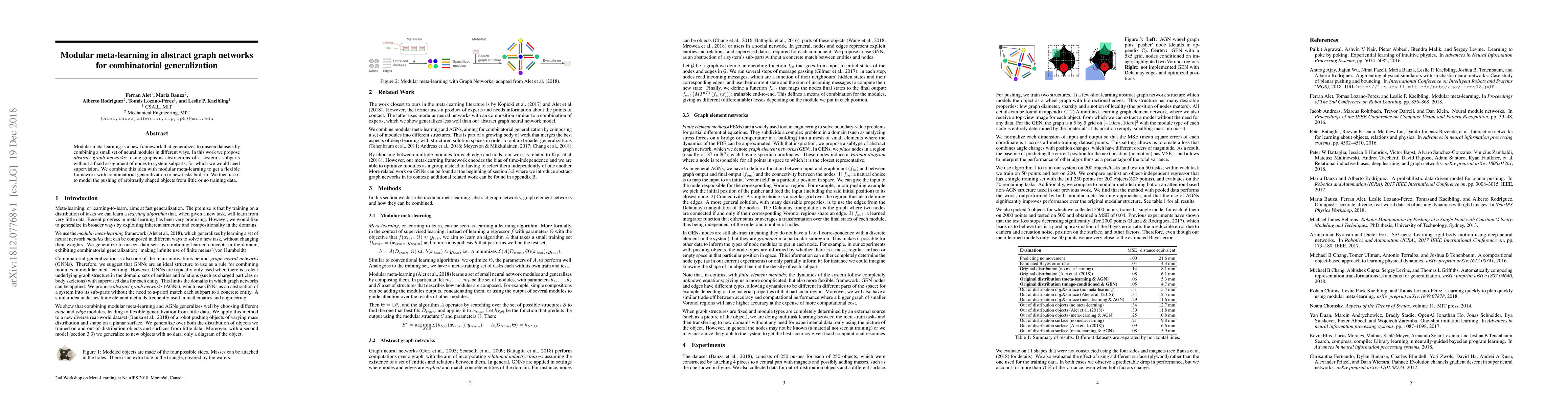 This paper proposes modular meta-learning combined with abstract graph networks to achieve flexible, combinatorial generalization for unseen datasets. The approach models the pushing of arbitrarily shaped objects with minimal training data.