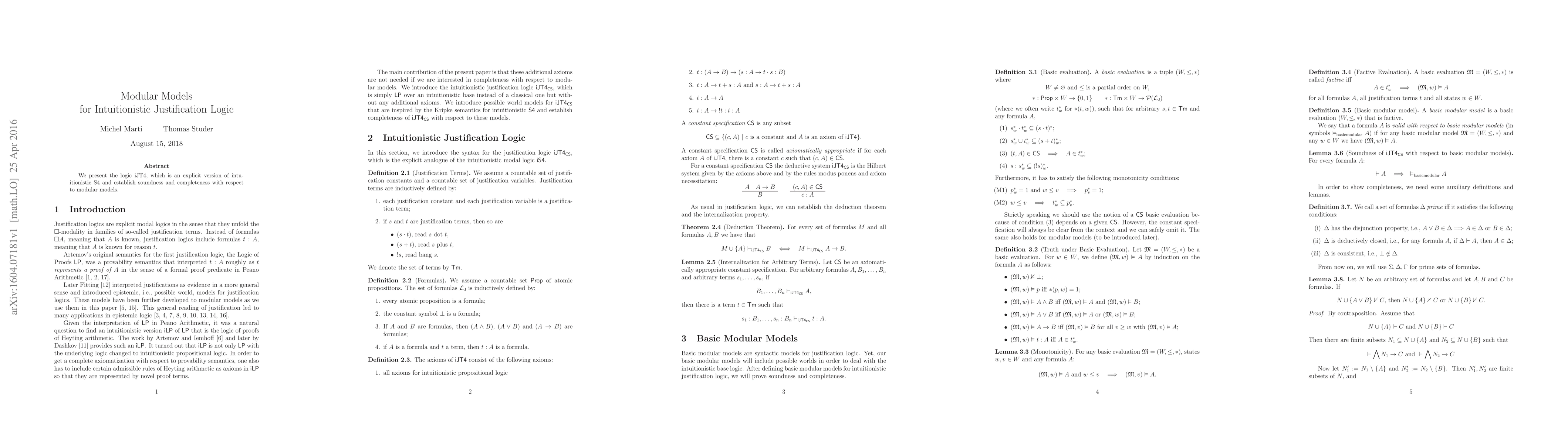 We present the logic iJT4, which is an explicit version of intuitionistic S4 and establish soundness and completeness with respect to modular models.