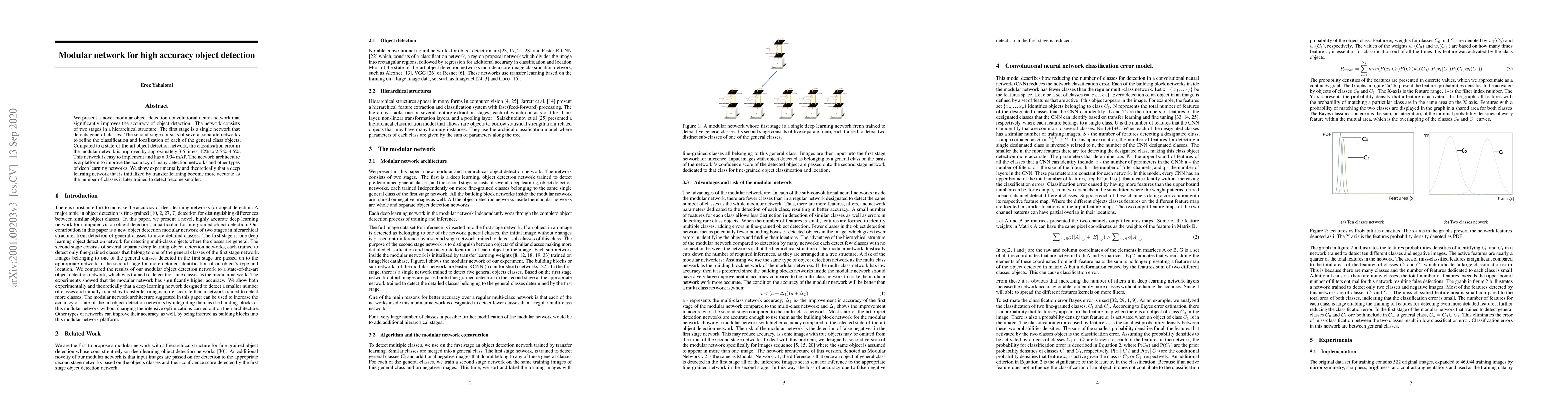 This paper introduces a modular convolutional neural network that enhances object detection accuracy through a hierarchical two-stage structure, achieving a 3-5 times reduction in classification error compared to state-of-the-art networks, with a high mean average precision of 0.94. The design facilitates easier implementation and potential improvements to other deep learning networks.