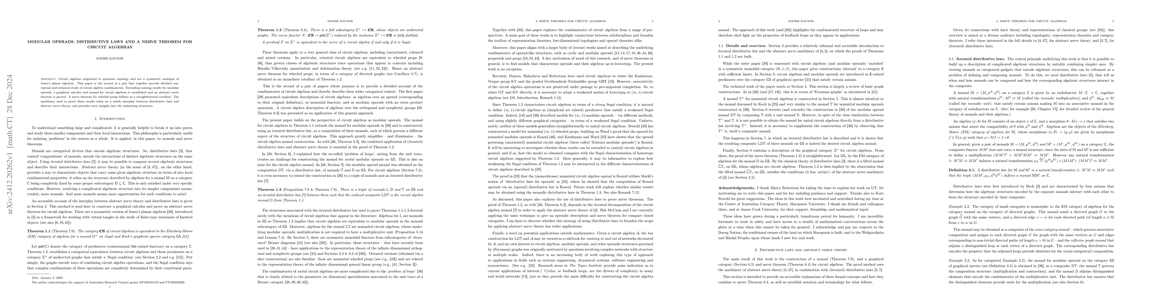This paper develops a graphical calculus and monad for circuit algebras, extending modular operads and proving an abstract nerve theorem, with a corollary for wheeled props. The results leverage a nuanced connection between distributive laws and abstract nerve theory to deepen understanding of circuit algebra combinatorics.
