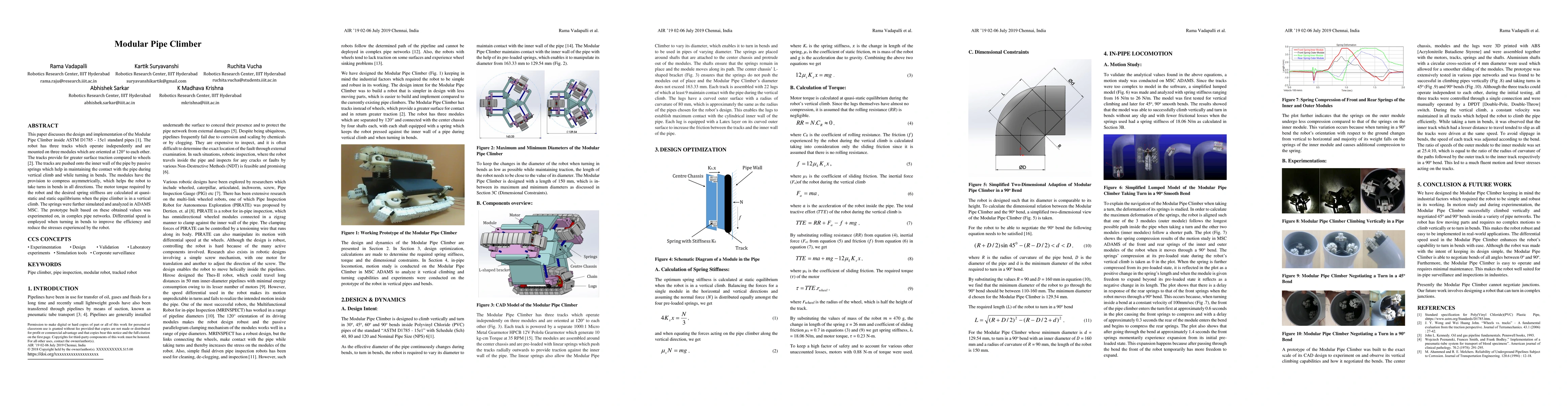 This paper discusses the design and implementation of the Modular Pipe Climber inside ASTM D1785 - 15e1 standard pipes [1]. The robot has three tracks which operate independently and are mounted on three modules which are oriented at 120{\deg} to each other. The tracks provide for greater surface traction compared to wheels [2]. The tracks are pushed onto the inner wall of the pipe by passive springs which help in maintaining the contact with the pipe during vertical climb and while turning in bends. The modules have the provision to compress asymmetrically, which helps the robot to take turns in bends in all directions. The motor torque required by the robot and the desired spring stiffness are calculated at quasistatic and static equilibriums when the pipe climber is in a vertical climb. The springs were further simulated and analyzed in ADAMS MSC. The prototype built based on these obtained values was experimented on, in complex pipe networks. Differential speed is employed when turning in bends to improve the efficiency and reduce the stresses experienced by the robot.