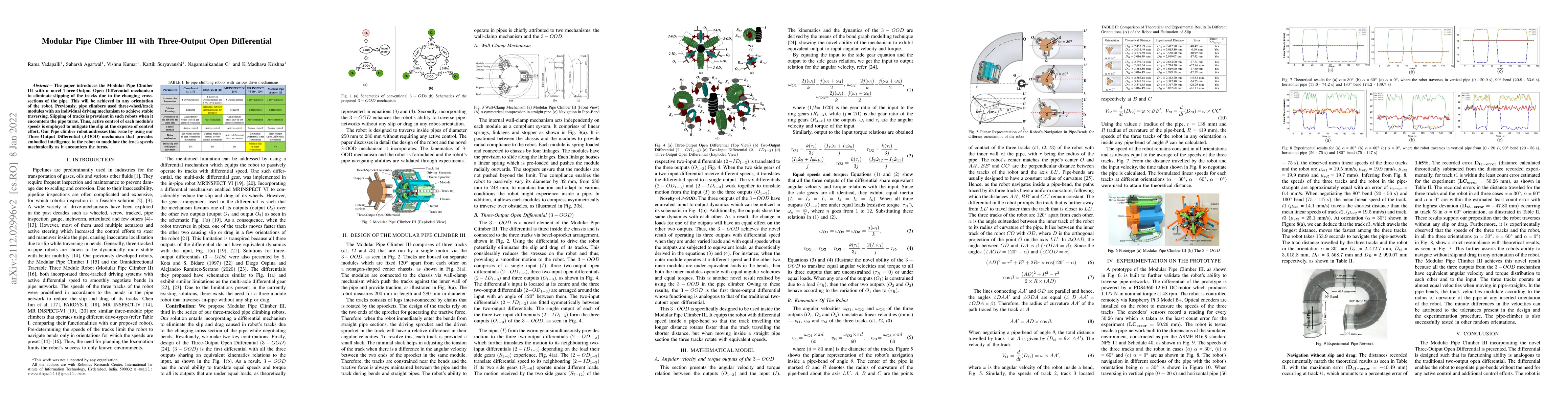 The Modular Pipe Climber III utilizes a Three-Output Open Differential (3-OOD) mechanism to prevent track slipping in varying pipe cross-sections, offering stable traversal in any orientation without the need for substantial control effort. This innovative design mechanically modulates track speeds to navigate turns efficiently.