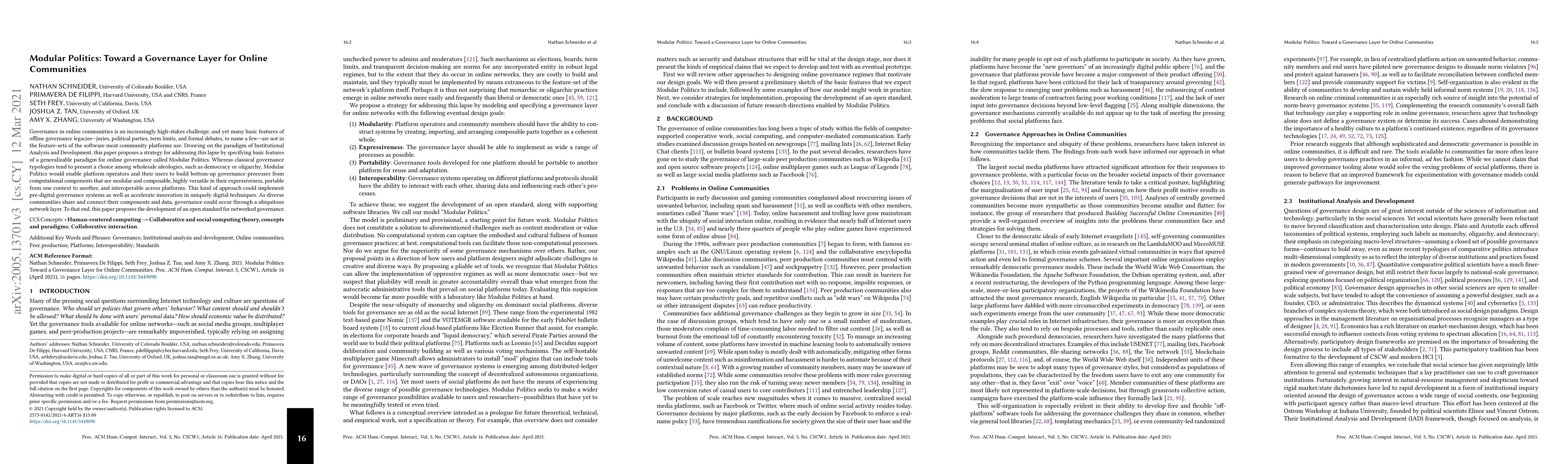 This paper proposes Modular Politics, a framework for creating adaptable and interoperable governance structures for online communities, drawing from Institutional Analysis and Development. It aims to enable bottom-up governance through modular, composable components, fostering innovation and interoperability across platforms.