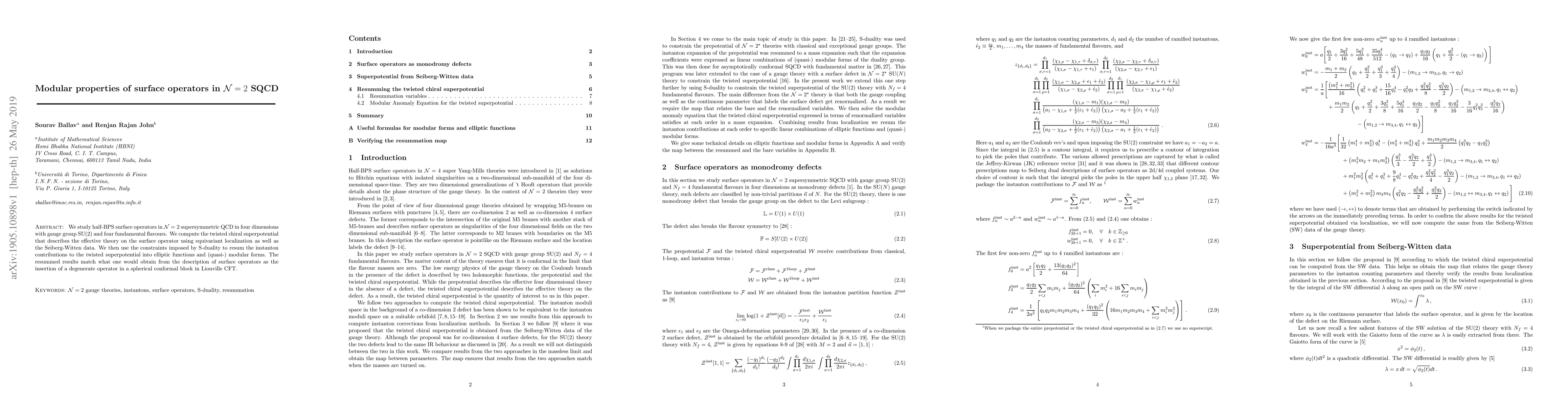 This paper investigates half-BPS surface operators in N=2 supersymmetric QCD, calculating the twisted chiral superpotential via equivariant localization and Seiberg-Witten data. It employs S-duality to express instanton contributions as elliptic functions and modular forms, matching results with Liouville CFT.