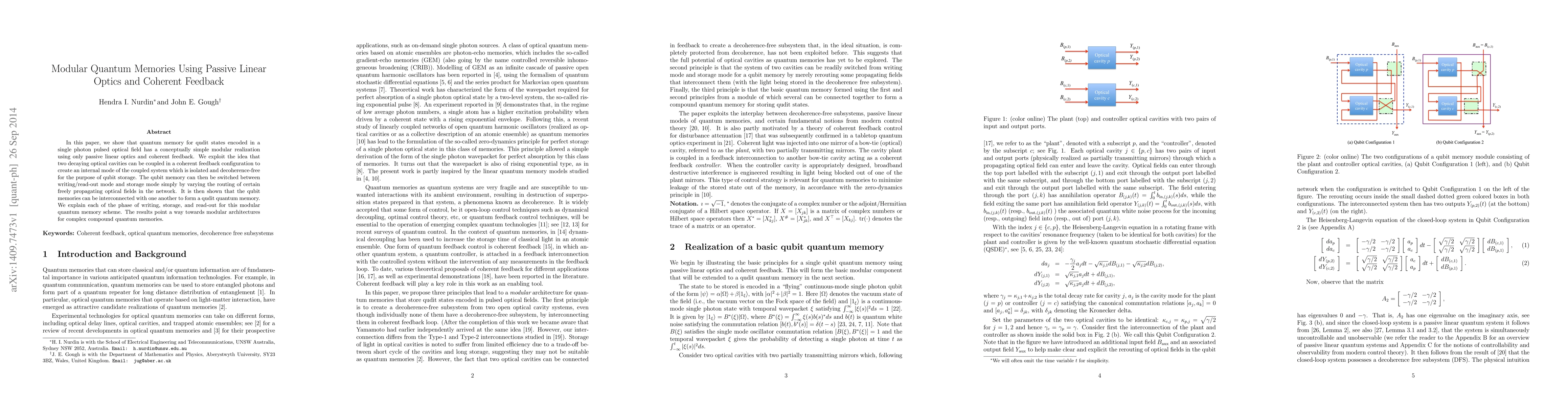 This paper proposes a modular quantum memory system for qudit states using passive linear optics and coherent feedback. It demonstrates how two coupled optical cavities can store qubits in a decoherence-free mode, which can be switched between operational modes by routing optical fields, enabling scalable qudit quantum memory architectures.