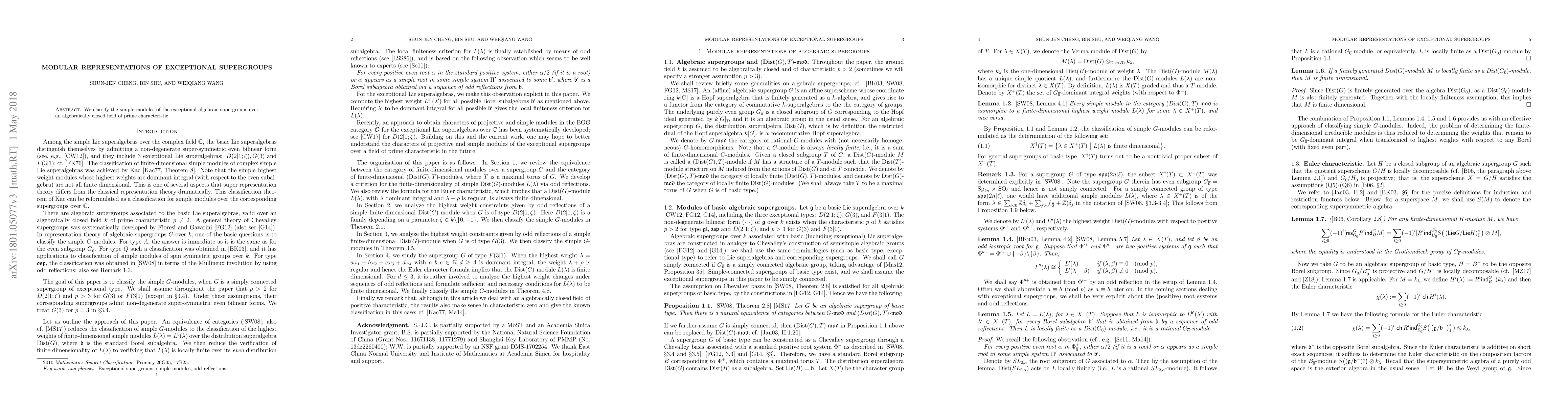 This paper classifies simple modules for exceptional algebraic supergroups over a field with prime characteristic, contributing to the understanding of their modular representation theory. The findings advance the study of algebraic structures in superalgebras.