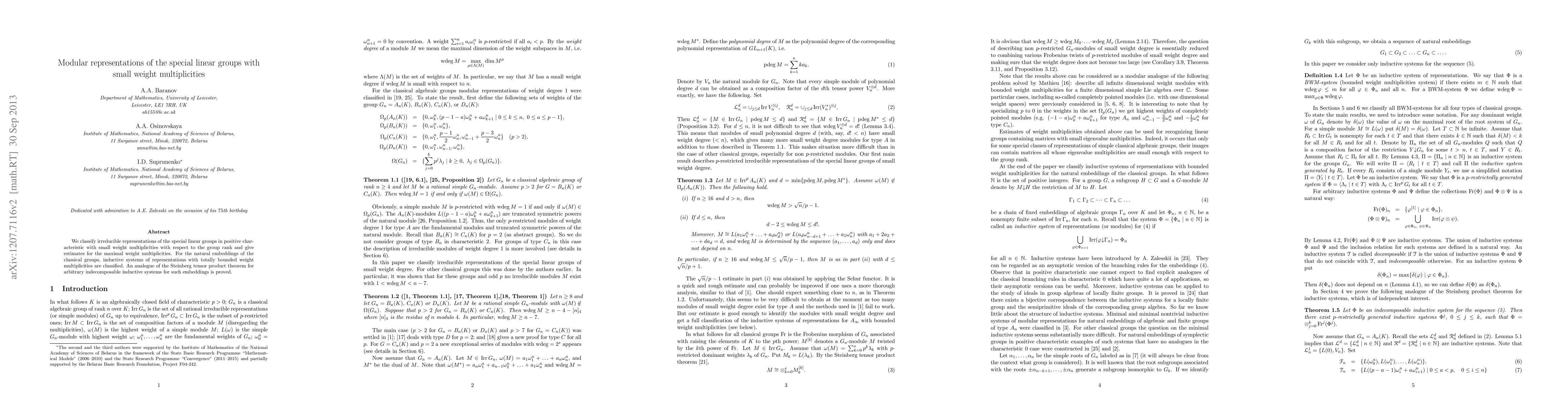 We classify irreducible representations of the special linear groups in positive characteristic with small weight multiplicities with respect to the group rank and give estimates for the maximal weight multiplicities. For the natural embeddings of the classical groups, inductive systems of representations with totally bounded weight multiplicities are classified. An analogue of the Steinberg tensor product theorem for arbitrary indecomposable inductive systems for such embeddings is proved.