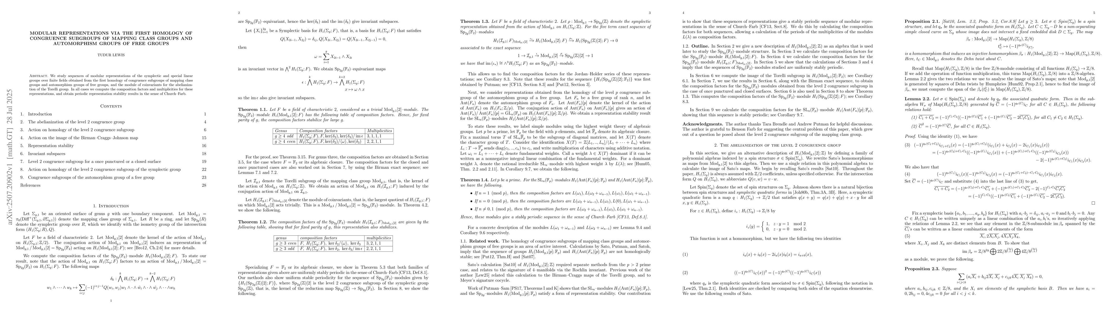 We study sequences of modular representations of the symplectic and special linear groups over finite fields obtained from the first homology of congruence subgroups of mapping class groups and automorphism groups of free groups, and the module of coinvariants for the abelianization of the Torelli group. In all cases we compute the composition factors and multiplicities for these representations, and obtain periodic representation stability results in the sense of Church--Farb.