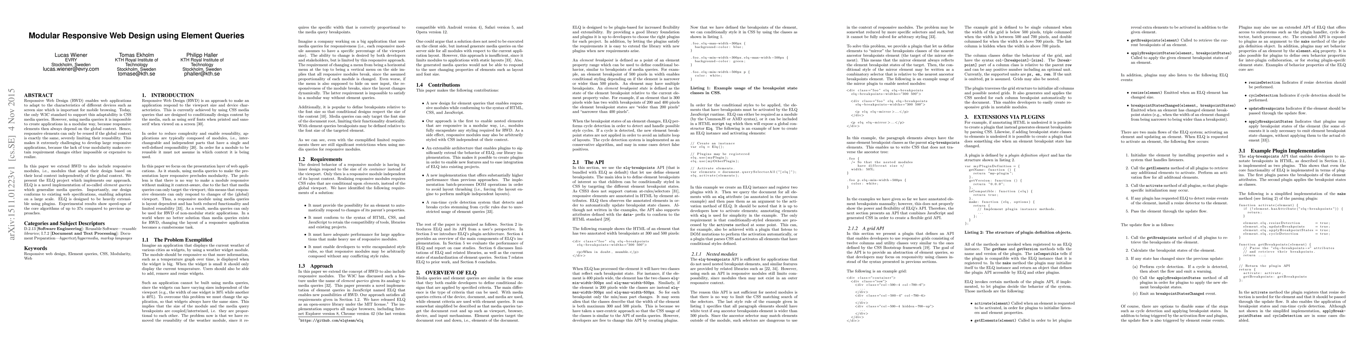 This paper proposes element queries to extend Responsive Web Design (RWD) by enabling modular, context-independent responsive elements, addressing the limitations of CSS media queries. The ELQ project implements this approach, showing significant performance improvements and compatibility with existing web standards.