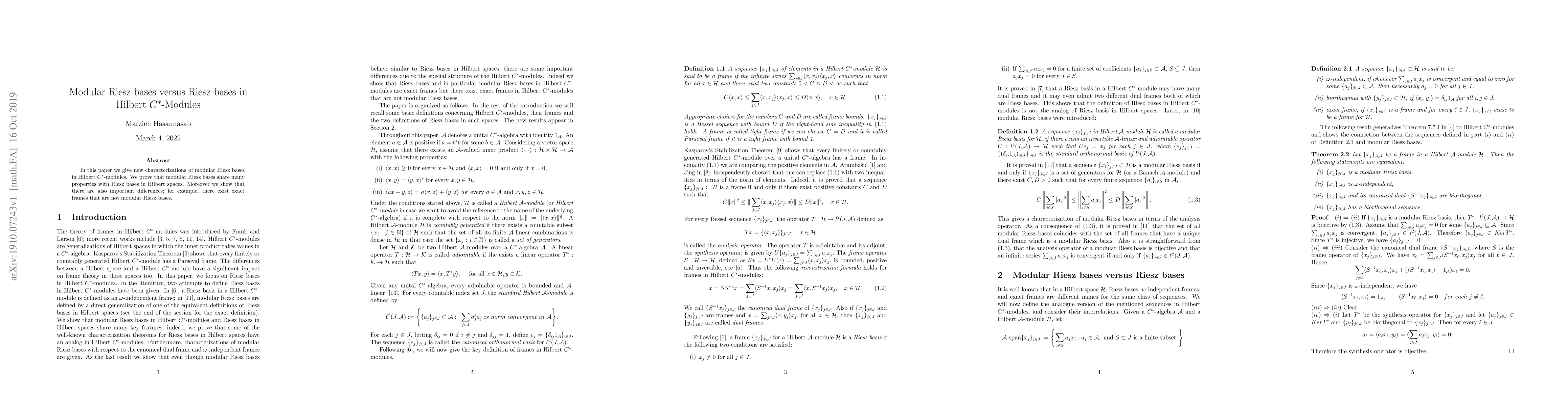 In this paper, we give new characterizations of modular Riesz bases in Hilbert $C^*$-modules. We prove that modular Riesz bases share many properties with Riesz bases in Hilbert spaces. Moreover we show that there are also important differences; for example, there exist exact frames that are not modular Riesz bases.