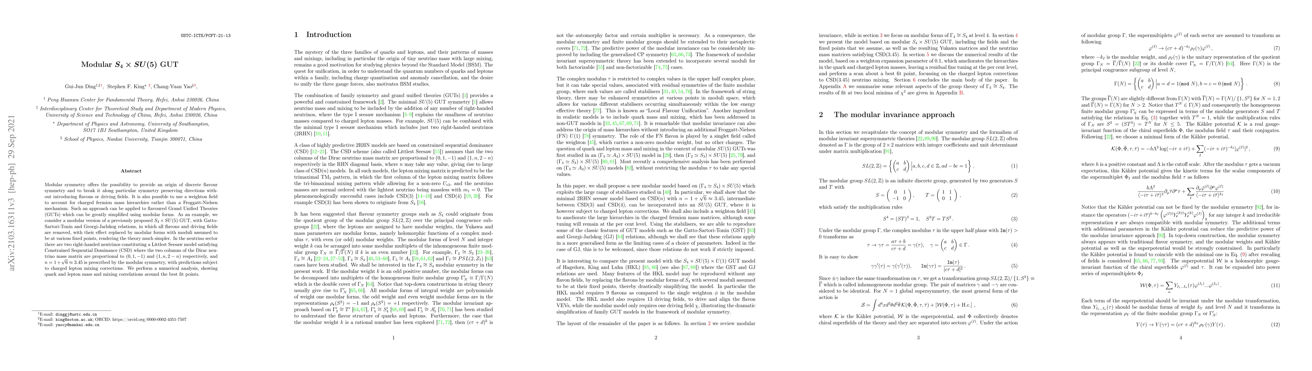This paper proposes a modular $S_4\times SU(5)$ Grand Unified Theory (GUT) that simplifies the framework by replacing flavons and driving fields with modular forms, leading to a more straightforward model. It predicts specific neutrino mass hierarchies and mixing correlations derived from modular symmetry.