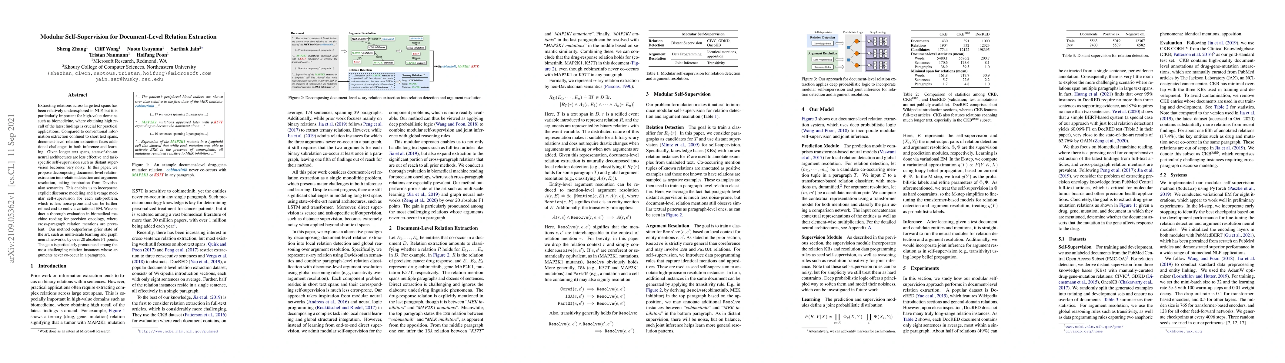 Extracting relations across large text spans has been relatively underexplored in NLP, but it is particularly important for high-value domains such as biomedicine, where obtaining high recall of the latest findings is crucial for practical applications. Compared to conventional information extraction confined to short text spans, document-level relation extraction faces additional challenges in both inference and learning. Given longer text spans, state-of-the-art neural architectures are less effective and task-specific self-supervision such as distant supervision becomes very noisy. In this paper, we propose decomposing document-level relation extraction into relation detection and argument resolution, taking inspiration from Davidsonian semantics. This enables us to incorporate explicit discourse modeling and leverage modular self-supervision for each sub-problem, which is less noise-prone and can be further refined end-to-end via variational EM. We conduct a thorough evaluation in biomedical machine reading for precision oncology, where cross-paragraph relation mentions are prevalent. Our method outperforms prior state of the art, such as multi-scale learning and graph neural networks, by over 20 absolute F1 points. The gain is particularly pronounced among the most challenging relation instances whose arguments never co-occur in a paragraph.
