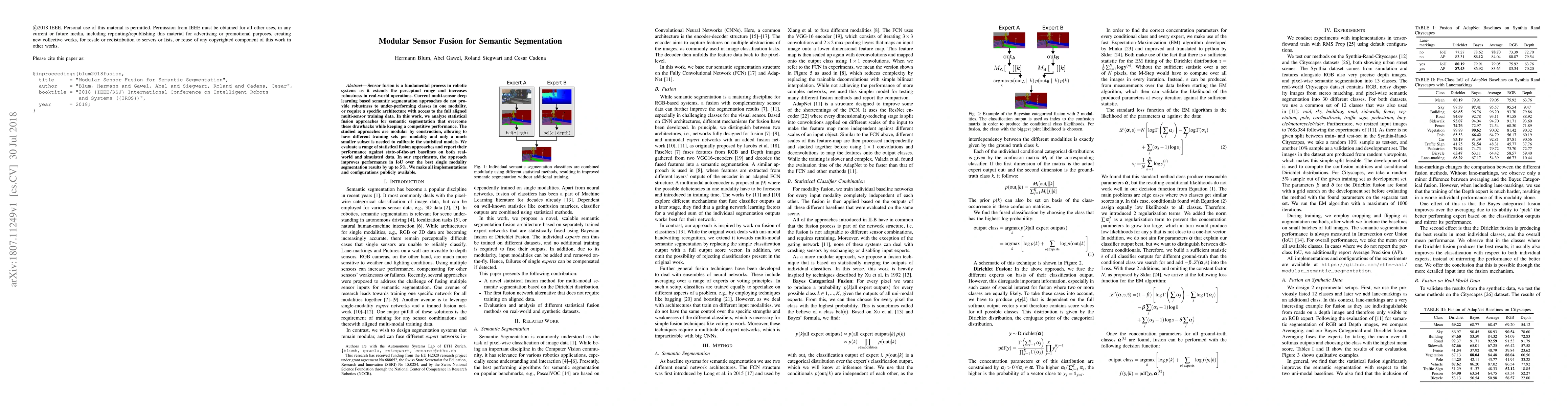 This paper proposes modular sensor fusion techniques for semantic segmentation that enhance robustness and performance, especially for under-performing classes. The modular approaches allow different training sets per modality and require minimal calibration data, achieving up to 5% improvement in Intersection over Union (IoU) compared to single modality results.