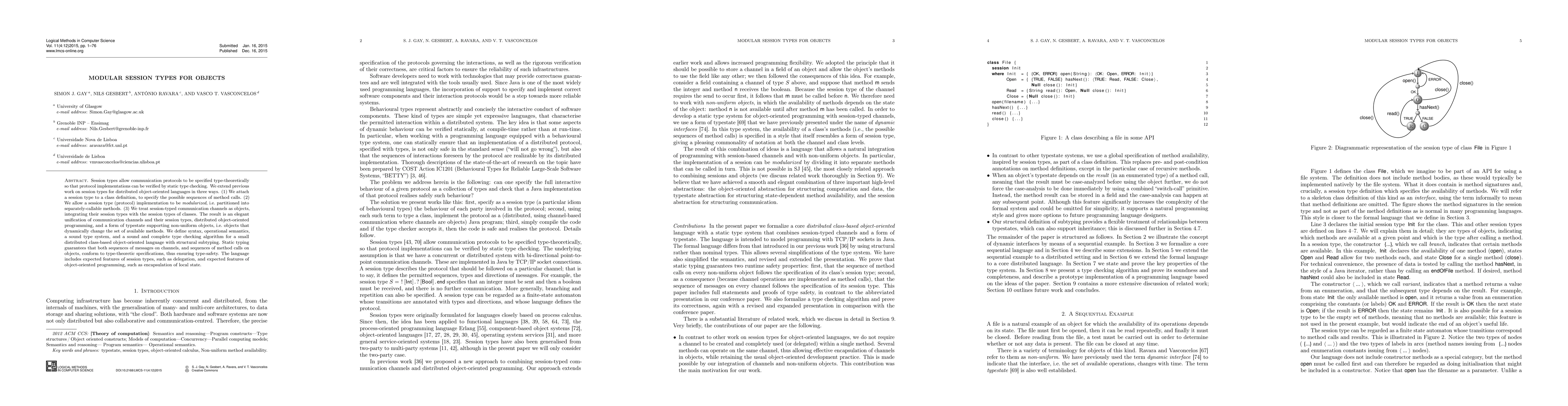 Session types allow communication protocols to be specified type-theoretically so that protocol implementations can be verified by static type checking. We extend previous work on session types for distributed object-oriented languages in three ways. (1) We attach a session type to a class definition, to specify the possible sequences of method calls. (2) We allow a session type (protocol) implementation to be modularized, i.e. partitioned into separately-callable methods. (3) We treat session-typed communication channels as objects, integrating their session types with the session types of classes. The result is an elegant unification of communication channels and their session types, distributed object-oriented programming, and a form of typestate supporting non-uniform objects, i.e. objects that dynamically change the set of available methods. We define syntax, operational se-mantics, a sound type system, and a sound and complete type checking algorithm for a small distributed class-based object-oriented language with structural subtyping. Static typing guarantees that both sequences of messages on channels, and sequences of method calls on objects, conform to type-theoretic specifications, thus ensuring type-safety. The language includes expected features of session types, such as delegation, and expected features of object-oriented programming, such as encapsulation of local state.