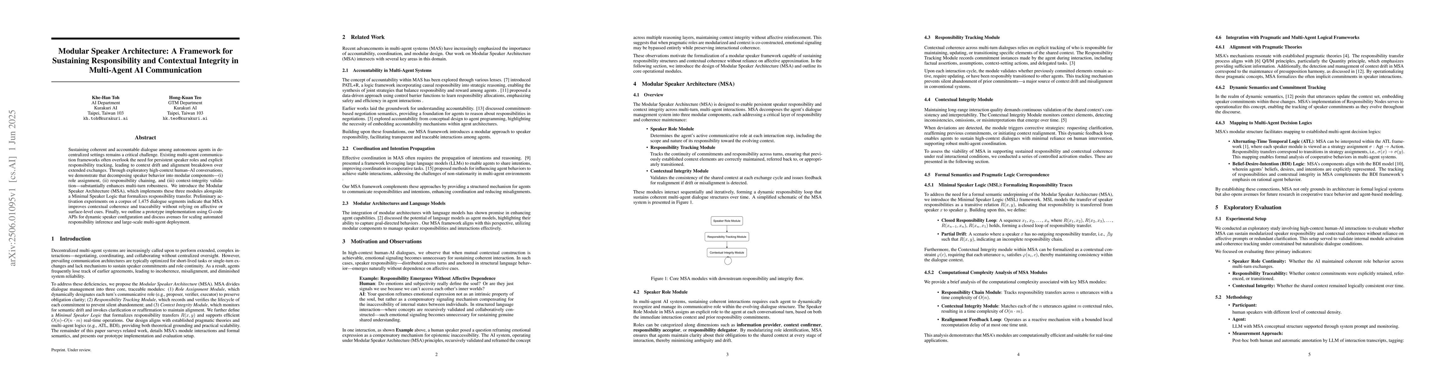 Sustaining coherent, role-aware communication across multi-agent systems remains a foundational challenge in AI. Current frameworks often lack explicit mechanisms for speaker responsibility, leading to context drift, alignment instability, and degraded interpretability over time. We propose the Modular Speaker Architecture (MSA), a framework that decomposes speaker behavior into modular components for role tracking, responsibility continuity, and contextual coherence. Grounded in high-context human-AI dialogues, MSA includes three core modules: a Speaker Role Module, a Responsibility Chain Tracker, and a Contextual Integrity Validator. We evaluate MSA through annotated case studies and introduce structural metrics-pragmatic consistency, responsibility flow, and context stability-quantified via manual and automatic scoring and bootstrapped statistical analysis. Our results show that MSA reliably maintains interaction structure without reliance on affective signals or surface-level heuristics. We further implement a prototype configuration language (G-Code) and modular API to support MSA deployment in dynamic multi-agent scenarios.