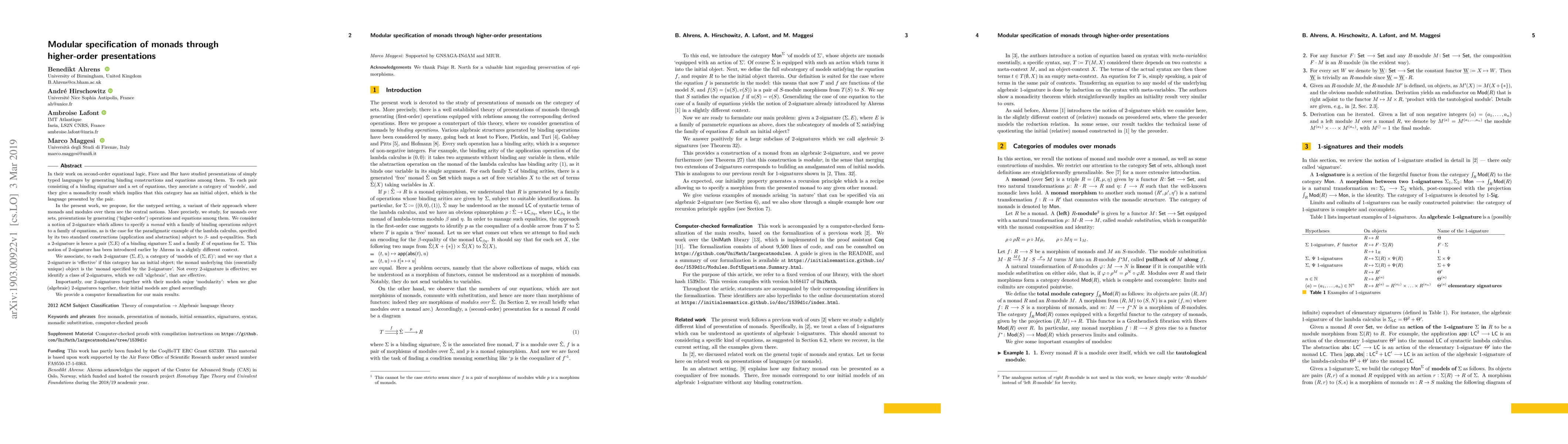In their work on second-order equational logic, Fiore and Hur have studied presentations of simply typed languages by generating binding constructions and equations among them. To each pair consisting of a binding signature and a set of equations, they associate a category of `models', and they give a monadicity result which implies that this category has an initial object, which is the language presented by the pair. In the present work, we propose, for the untyped setting, a variant of their approach where monads and modules over them are the central notions. More precisely, we study, for monads over sets, presentations by generating (`higher-order') operations and equations among them. We consider a notion of 2-signature which allows to specify a monad with a family of binding operations subject to a family of equations, as is the case for the paradigmatic example of the lambda calculus, specified by its two standard constructions (application and abstraction) subject to $\beta$- and $\eta$-equalities. Such a 2-signature is hence a pair $(\Sigma,E)$ of a binding signature $\Sigma$ and a family $E$ of equations for $\Sigma$. This notion of 2-signature has been introduced earlier by Ahrens in a slightly different context. We associate, to each 2-signature $(\Sigma,E)$, a category of `models of $(\Sigma,E)$; and we say that a 2-signature is `effective' if this category has an initial object; the monad underlying this (essentially unique) object is the `monad specified by the 2-signature'. Not every 2-signature is effective; we identify a class of 2-signatures, which we call `algebraic', that are effective. Importantly, our 2-signatures together with their models enjoy `modularity': when we glue (algebraic) 2-signatures together, their initial models are glued accordingly. We provide a computer formalization for our main results.
