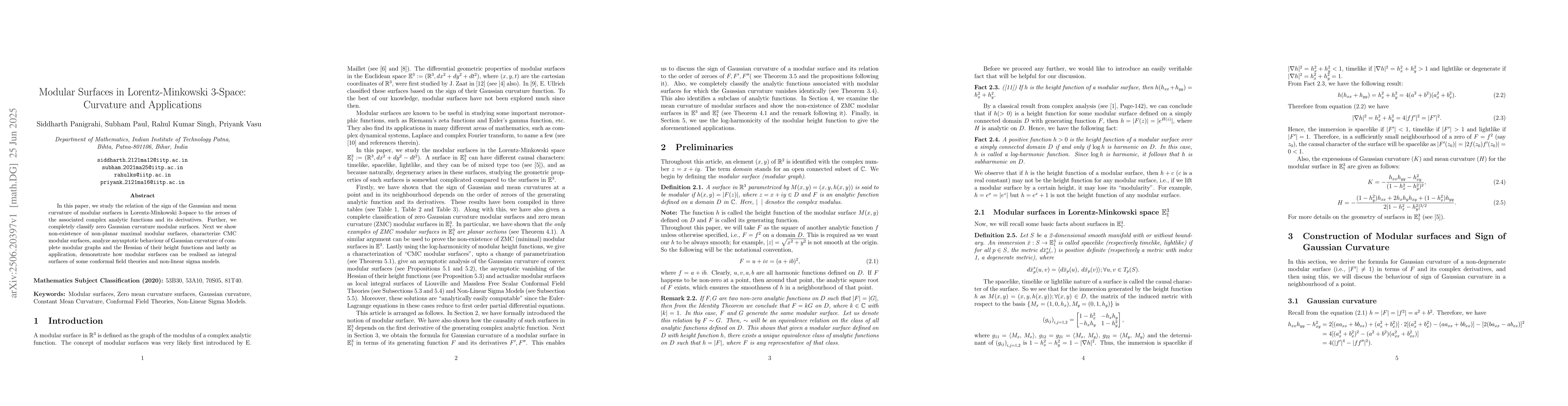 In this paper, we study the relation of the sign of the Gaussian and mean curvature of modular surfaces in Lorentz-Minkowski $3$-space to the zeroes of the associated complex analytic functions and its derivatives. Further, we completely classify zero Gaussian curvature modular surfaces. Next we show non-existence of non-planar maximal modular surfaces, characterize CMC modular surfaces, analyze asymptotic behaviour of Gaussian curvature of complete modular graphs and the Hessian of their height functions and lastly as application, demonstrate how modular surfaces can be realised as integral surfaces of some conformal field theories and non-linear sigma models.