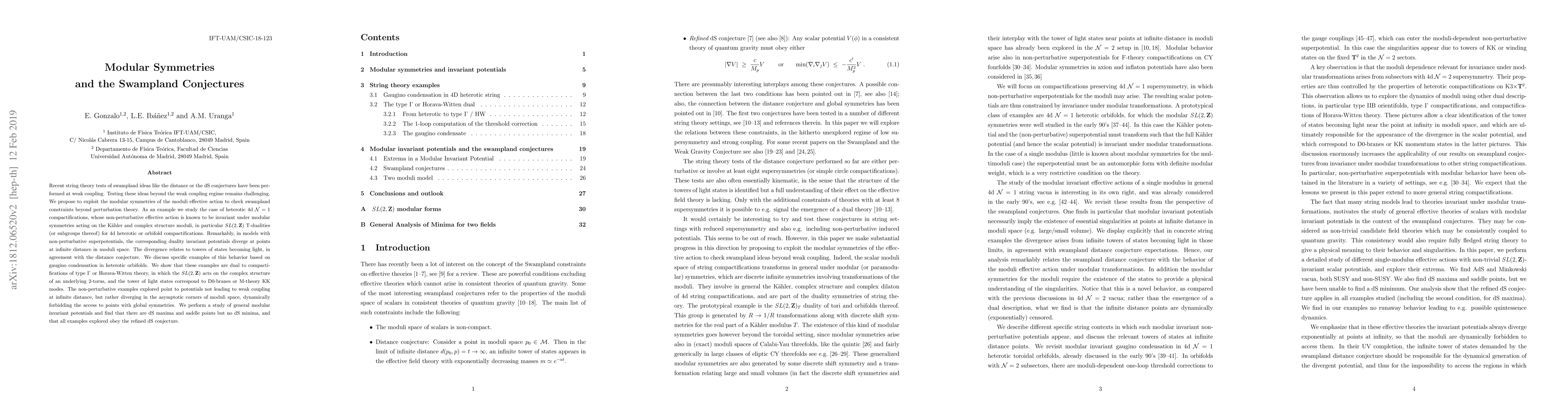 The novelty of this work lies in its application of modular symmetries to test swampland conjectures beyond weak coupling, revealing new insights into the dynamics of string theory at infinite distance and its implications for global symmetries and de Sitter space.