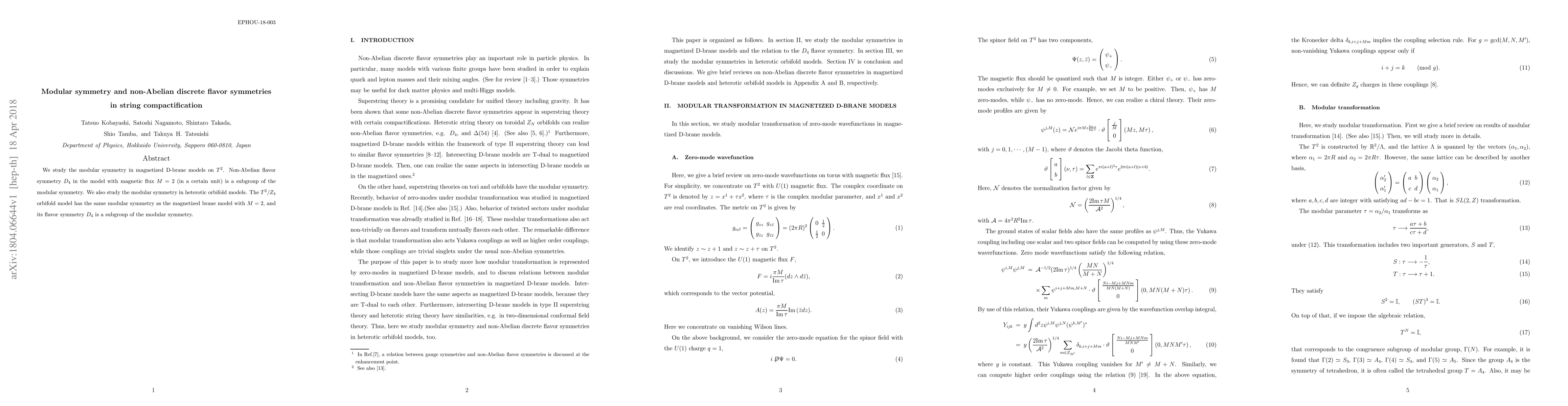 This paper explores modular symmetry in magnetized D-brane models on $T^2$ and heterotic orbifold models, finding that the non-Abelian discrete flavor symmetry $D_4$ in these compactifications is a subgroup of the modular symmetry. The $T^2/Z_4$ orbifold model shares the same modular symmetry as the magnetized brane model with $M=2$.