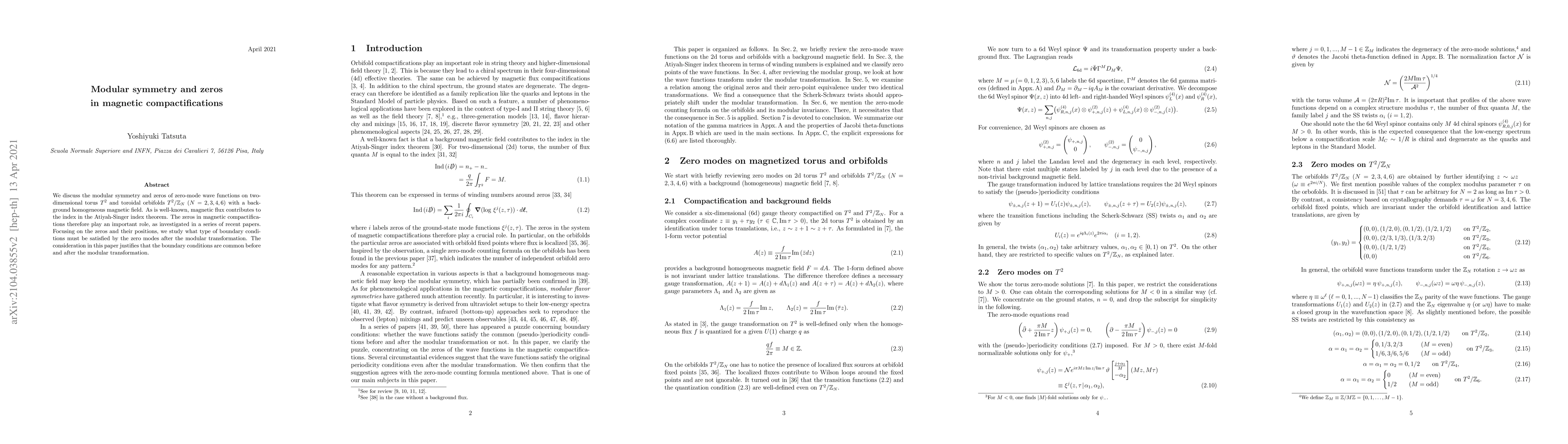 This paper investigates the modular symmetry and zeros of zero-mode wave functions in magnetic compactifications on two-dimensional torus and toroidal orbifolds, emphasizing the role of magnetic flux in the Atiyah-Singer index theorem. It concludes that the boundary conditions for zero modes remain consistent before and after modular transformations.