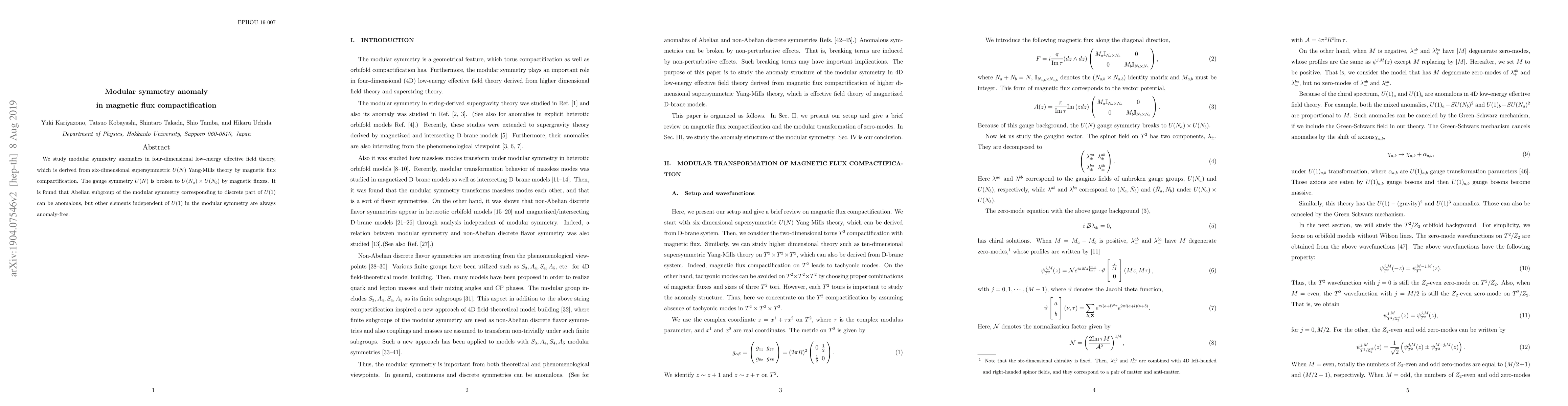 Summary: This paper investigates modular symmetry anomalies in four-dimensional effective field theories derived from six-dimensional supersymmetric Yang-Mills theory via magnetic flux compactification, finding that while the Abelian subgroup corresponding to $U(1)$ may be anomalous, other modular symmetry elements remain anomaly-free.