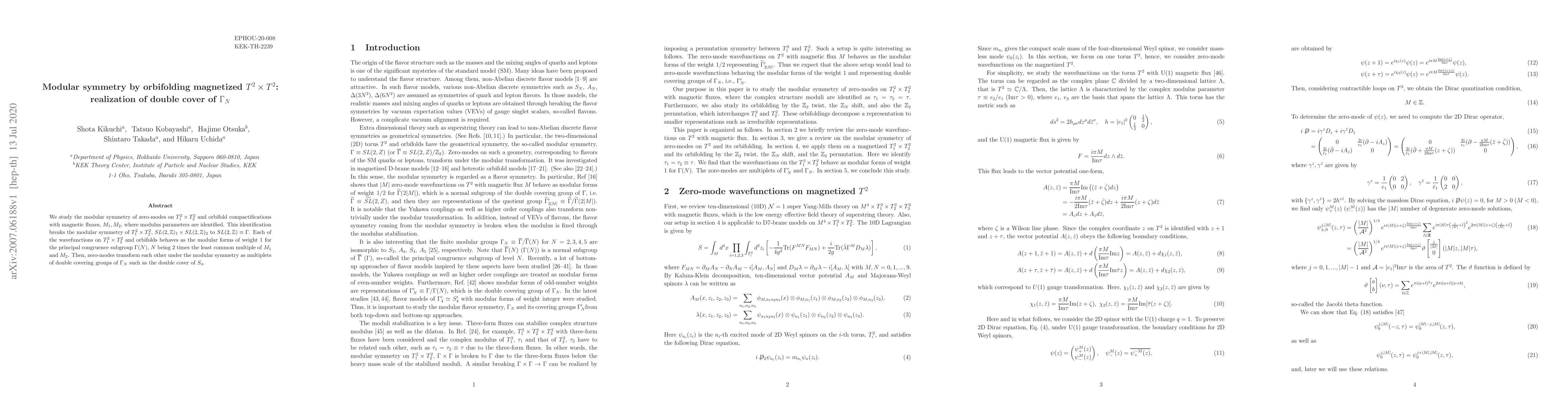 We study the modular symmetry of zero-modes on $T_1^2 \times T_2^2$ and orbifold compactifications with magnetic fluxes, $M_1,M_2$, where modulus parameters are identified. This identification breaks the modular symmetry of $T^2_1 \times T^2_2$, $SL(2,\mathbb{Z})_1 \times SL(2,\mathbb{Z})_2$ to $SL(2,\mathbb{Z})\equiv\Gamma$. Each of the wavefunctions on $T^2_1 \times T^2_2$ and orbifolds behaves as the modular forms of weight 1 for the principal congruence subgroup $\Gamma$($N$), $N$ being 2 times the least common multiple of $M_1$ and $M_2$. Then, zero-modes transform each other under the modular symmetry as multiplets of double covering groups of $\Gamma_N$ such as the double cover of $S_4$.
