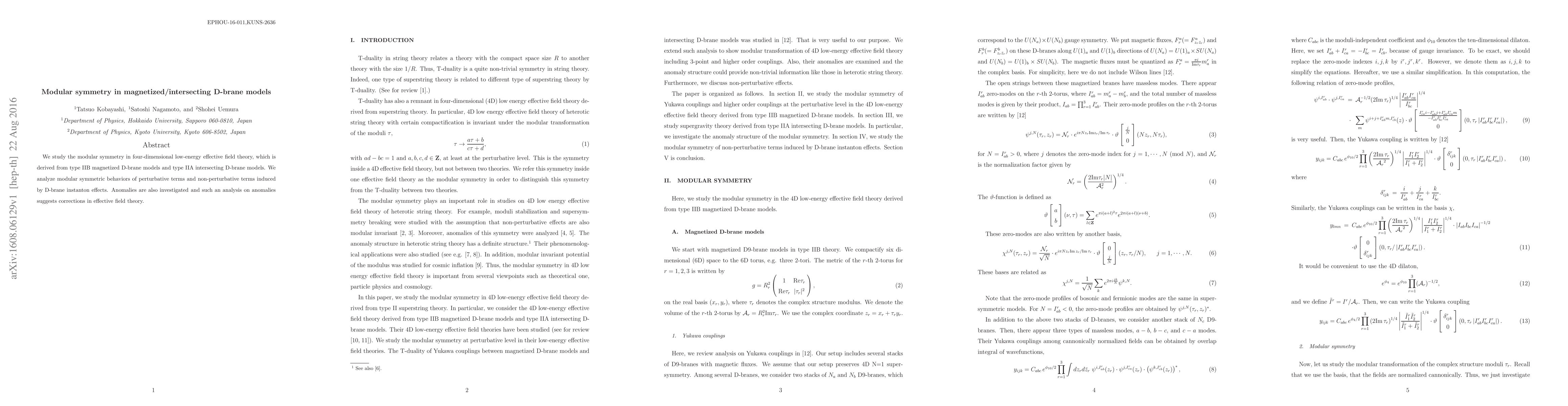 This paper investigates modular symmetry in low-energy effective field theories derived from magnetized D-branes in type IIB and intersecting D-branes in type IIA, focusing on both perturbative and non-perturbative terms. It also examines anomalies and proposes corrections in the effective field theory based on these findings.